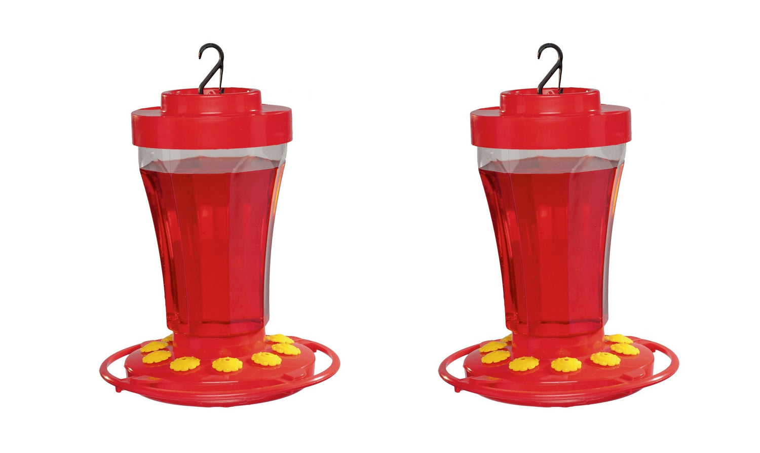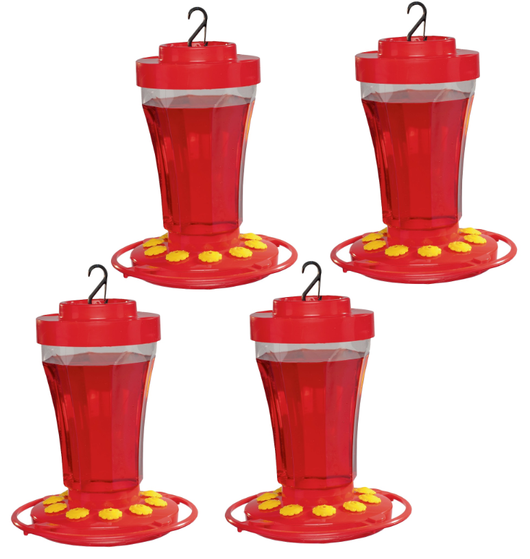 First Nature’s 32 oz. Hummingbird Flower Feeder’s red base with attractive yellow flowers really draws the birds and the yellow flowers discourage bees and wasps from entering the feeder. The perch provides the perfect position for birds to comfortably feed at any of the ten ports. The plastic wide-mouth fluted reservoir is easy to fill and easy to clean. The patented two-part base twists apart for thorough cleaning. All parts may be washed in warm soapy water. (Do not put any parts of this feeder in a dishwasher.) We recommend you use First Nature’s Hummingbird Nectar Concentrate which you can easily mix right in the reservoir.