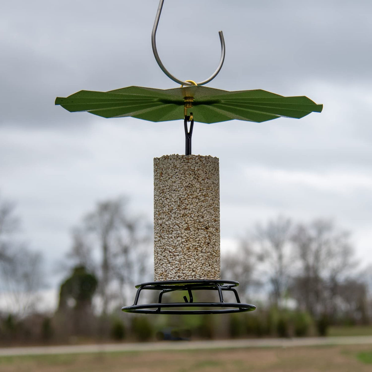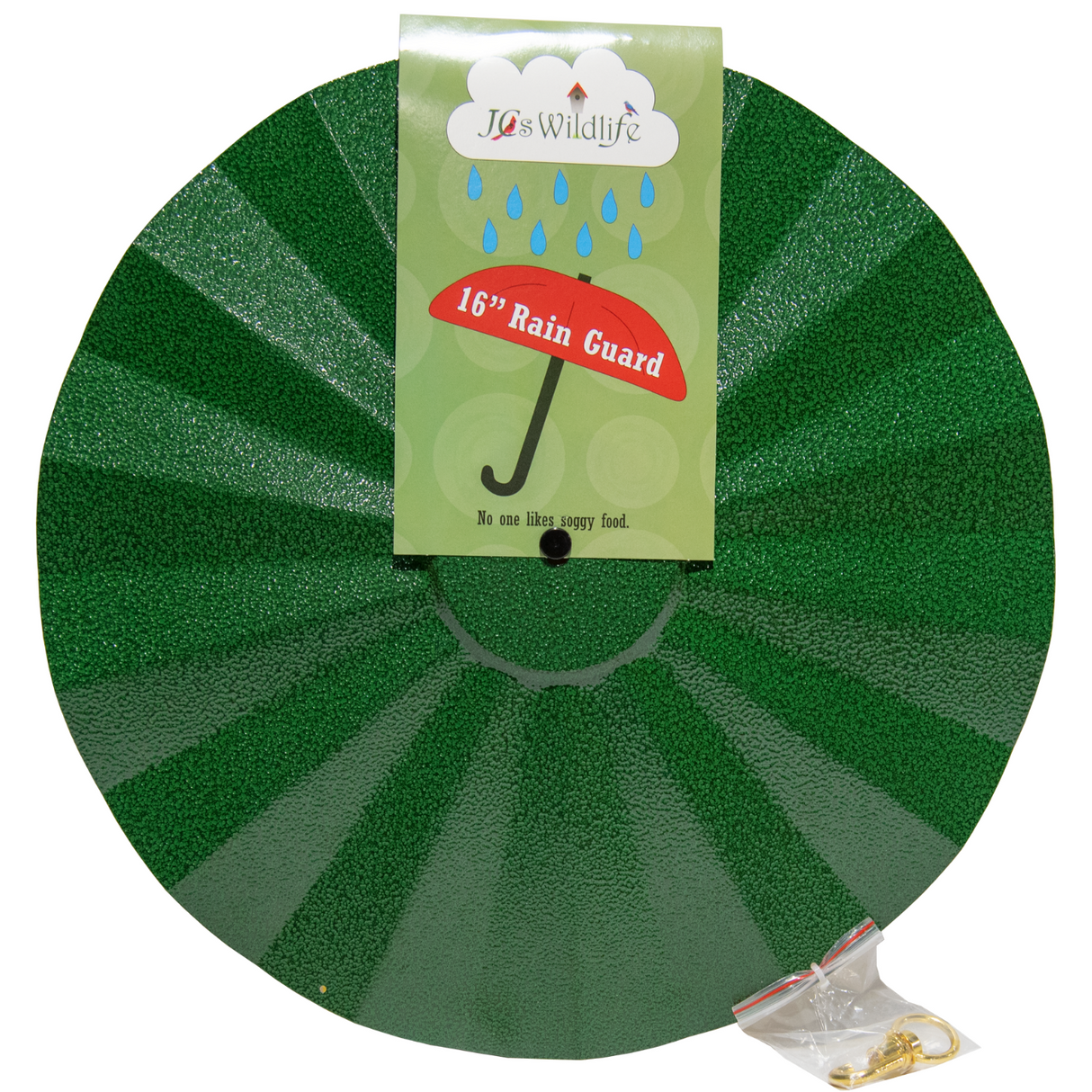 Protect your precious bird seed with the JCs Wildlife 16" Metal Rain Guard. Featuring a sturdy hook on the under side of the metal cover, hang your choice of bird seed cylinders and seed blocks closely underneath for maximum protection. This rain guard is treated with a protective powder coat paint which will stay vibrant in your garden for seasons to come--functionality with flair! Keep your bird seed dry, and your birds will be happy and healthy! Product manufactured in China.