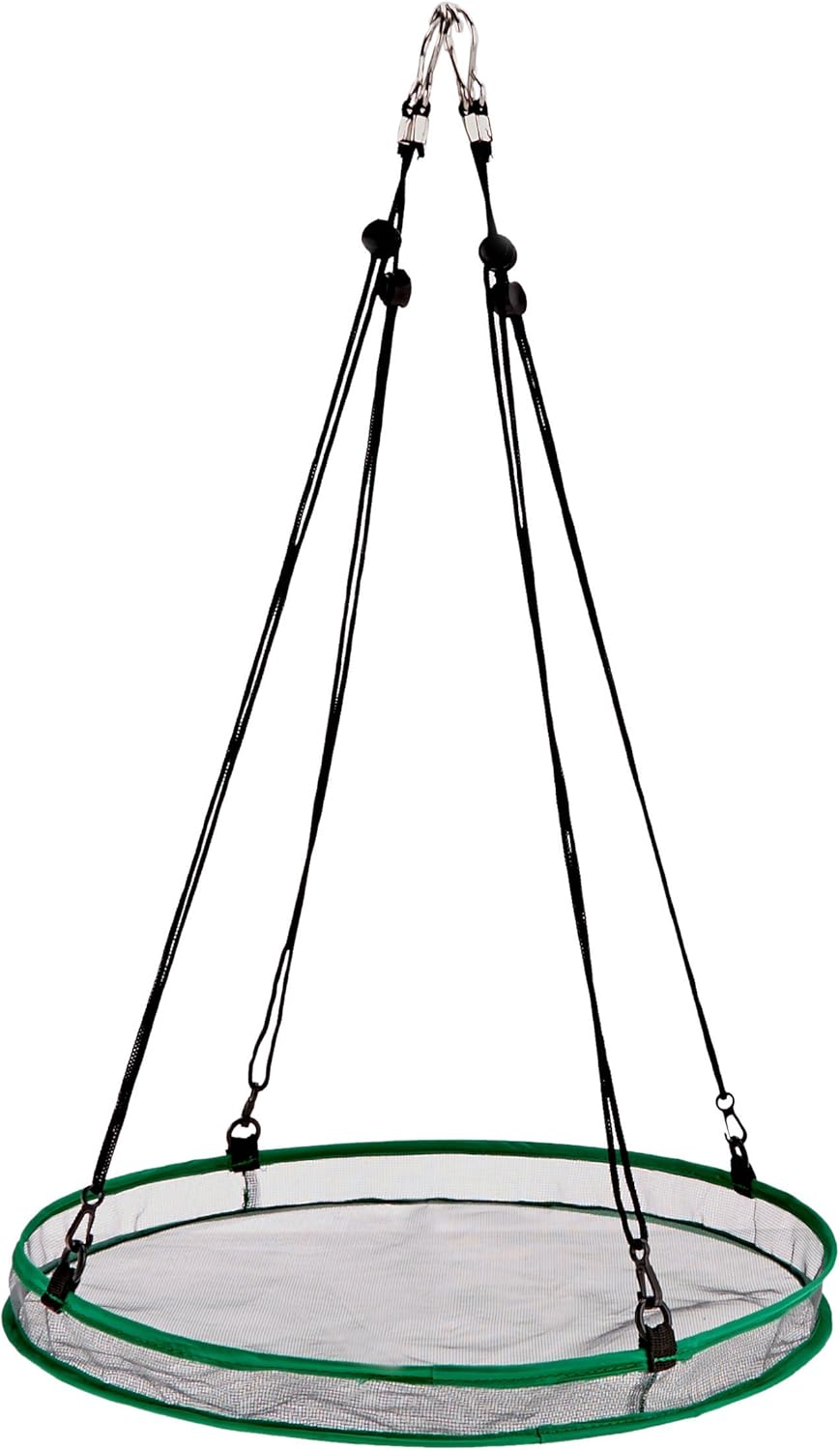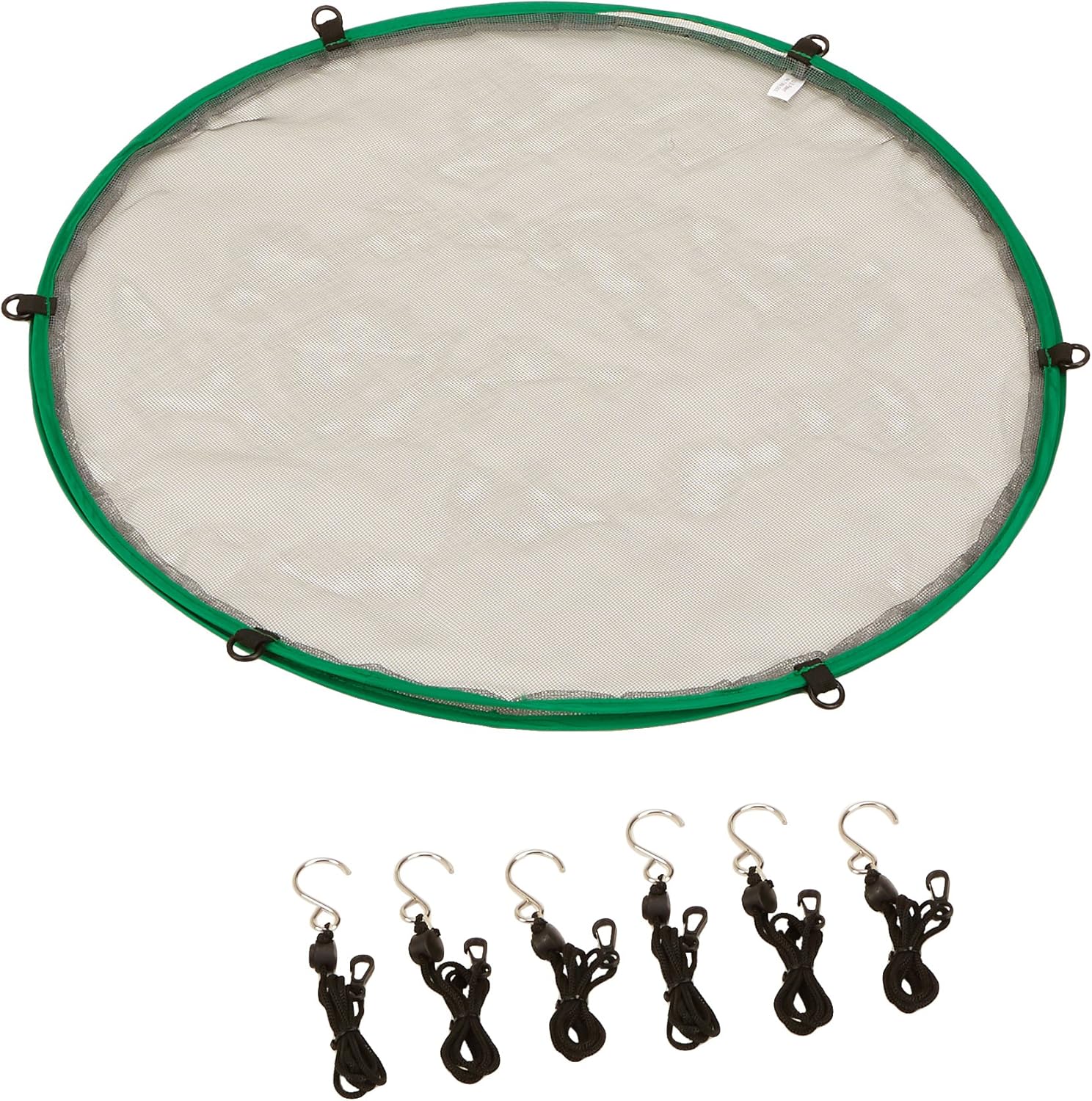 Product image showing a round hanging mesh food dehydrator with green trim black cords and silver clips.