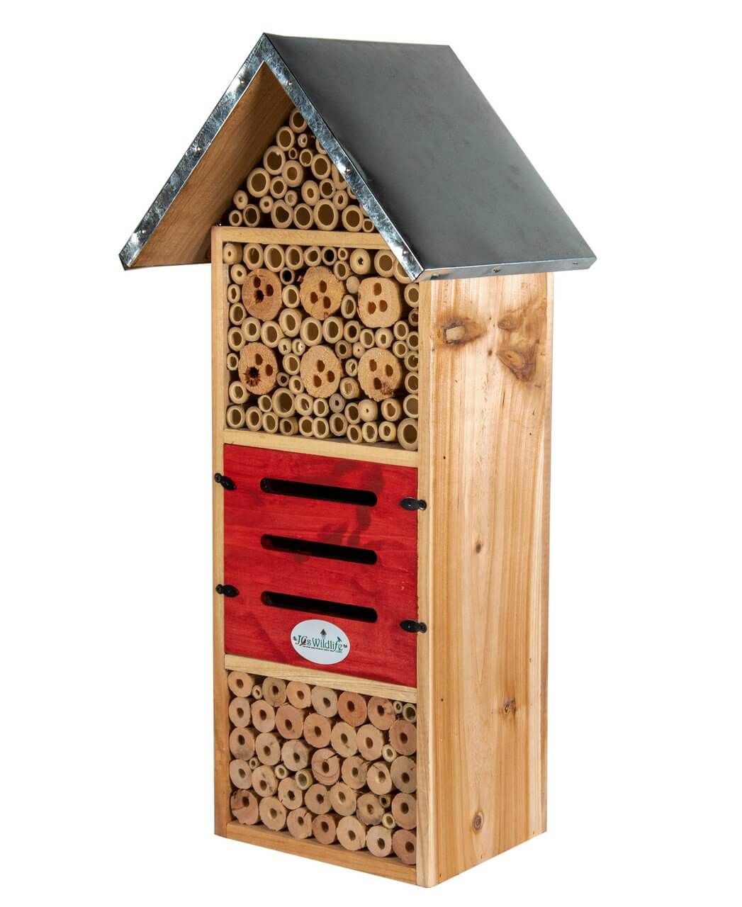 This wooden insect hotel is constructed with insects in mind, with a metal roof that will keep your insects safe from the elements and a cedar wood body that will look attractive and functional in your garden. The JCs Wildlife Tall Insect Hotel comes with one mounting screw, which will easily and securely mount your house. This insect hotel also comes pre-assembled with detailed instructions showing how to attract the solitary bees and lacewings to your house. After installation, this insect hotel should not need any regular maintenance following installation. One will only need to make sure that the house stays securely mounted and stationary.