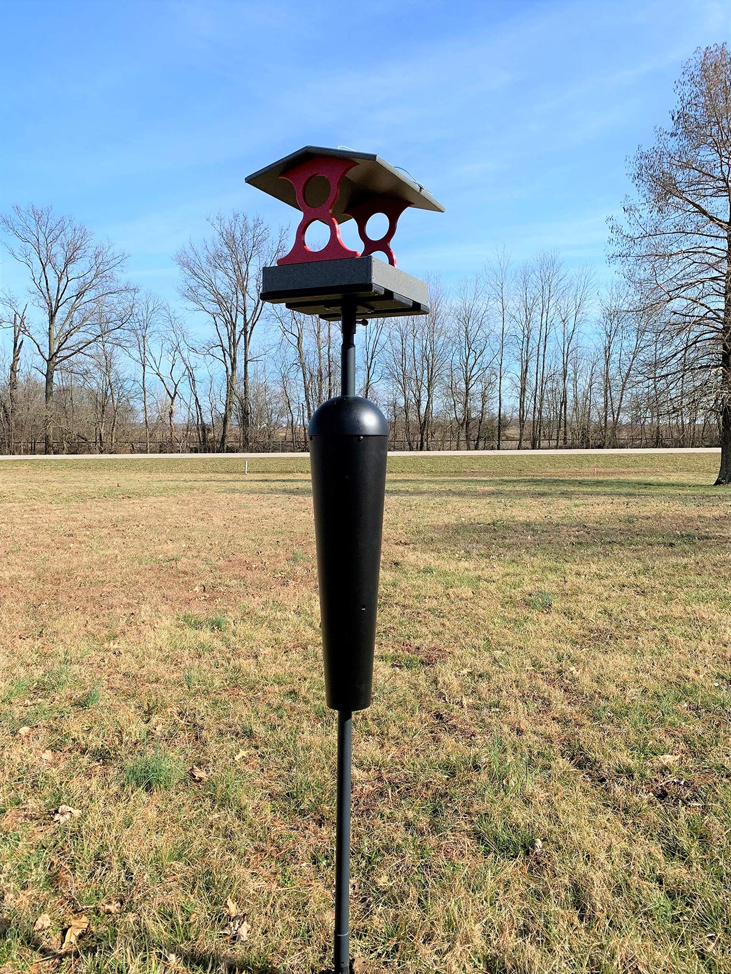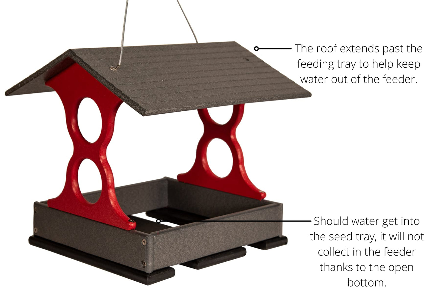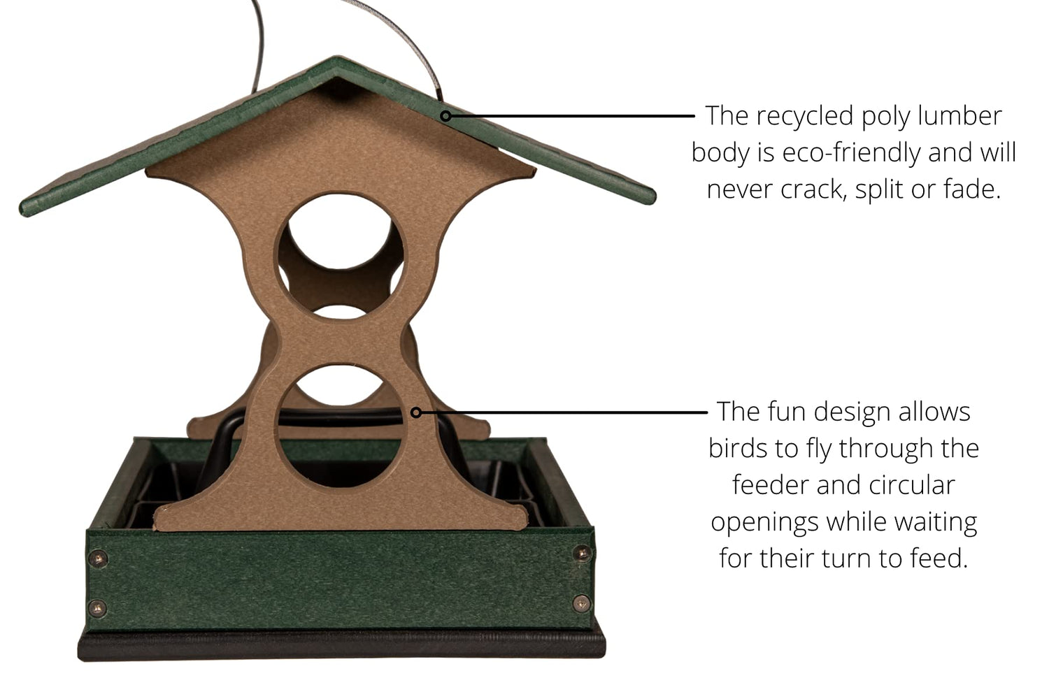 This expertly crafted and wonderfully designed fly-thru feeder by JCs Wildlife is sure to attract a wide variety of beautiful birds to your yard! The handle in the heavy duty plastic seed tray makes for easy removal. This fly-thru is easy to fill and clean while preventing mold from the buildup of wet seed. Removable stainless steel screws allow for an included, optional hanger, while the bottom poly allows for pole mounting, giving you full control over how you want your feeder to sit! The spacious tray design allows plenty of room for feeding and the holes in each end allow birds to perch and wait or just socialize. This medium fly-thru is made entirely of recycled poly lumber on site in Southern Indiana!