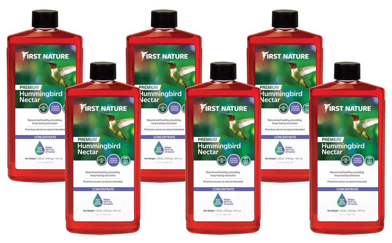 This 16 oz. bottle of concentrate makes a half gallon of feed! Talk to anyone who';s used First Nature Hummingbird Nectar Concentrate and they'll tell you they won't use anything else. Our Hummingbird Nectar Concentrate is a premium concentrated formula which contains sucrose, preferred by hummingbirds over monosaccharide glucose or fructose sugars. There are no messy sugars to boil or mix and no sticky cleanup. In fact, you can easily mix one part nectar to three parts water right in the feeder jar. FDA Red #40 added. Made in the USA.