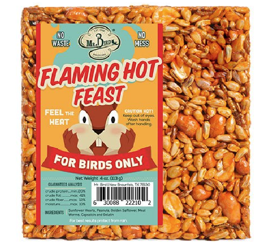 This 100% seed block will feed the birds while keeping the squirrels away. The convenient center hole allows for this seed cake to be mounted on a Mr. Bird cylinder feeder. What makes this product special is the formula; sunflower hearts, peanuts, golden safflower, meal worms and it is extra spicy.