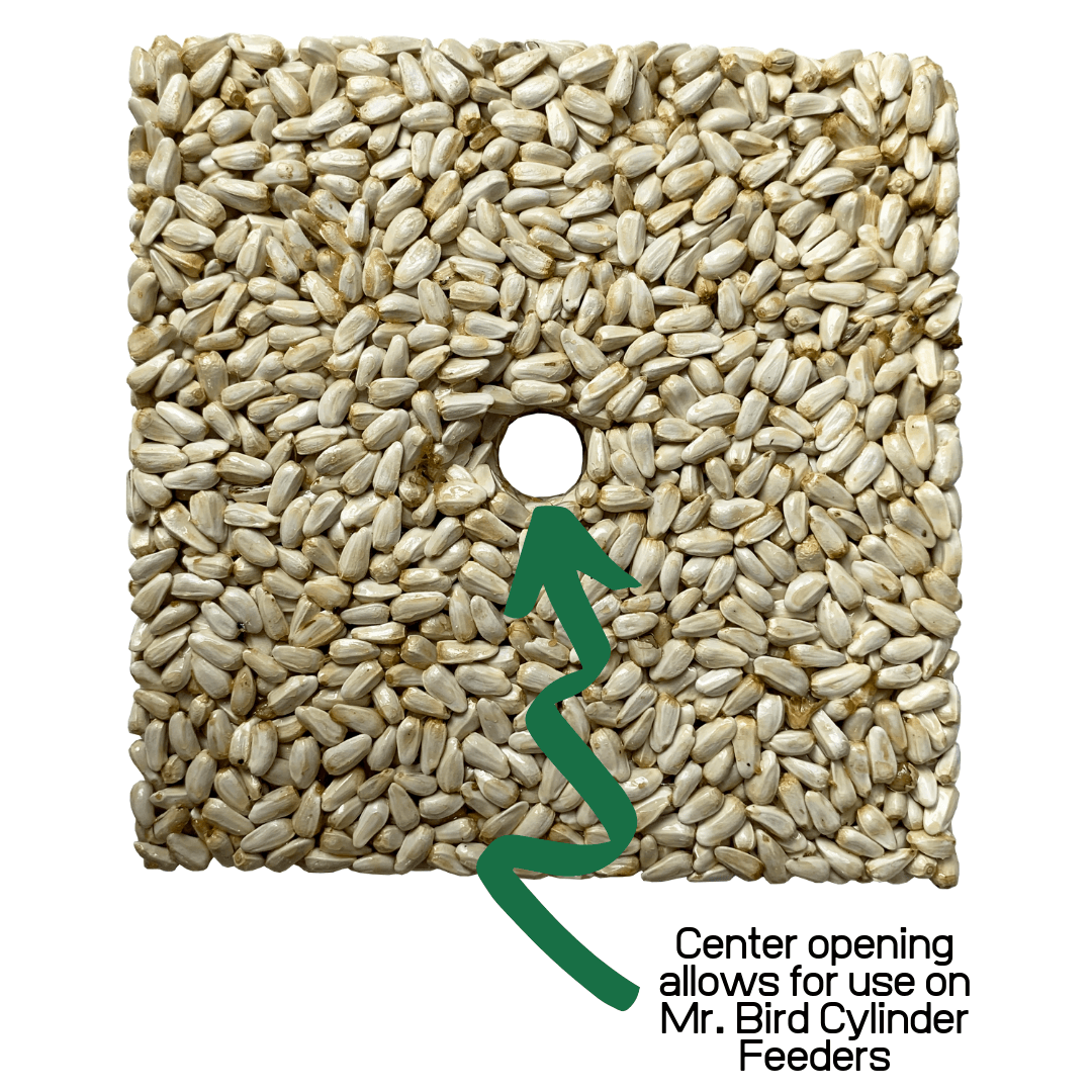 Cardinals are one of the most beloved backyard birds and now you can watch their bold, beautiful red wings in action while they visit your feeder. Get the best view of cardinals with easy-to-use safflower seed cakes. The convenient center hole allows for this seed cake to be mounted on a Mr. Bird cylinder feeder. This nutritious dynamic duo uses both safflower seed and gelatin in a compact seed cake to create a no-waste bird feeding solution. Remember, safflower also repels squirrels! Its a win-win-win situation. This Mr Bird seed cake will perform best when kept dry.