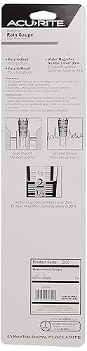 The AcuRite Magnifying Rain Gauge is an easy to read magnifying rain gauge. This item has a 5 in capacity; it is easy-to-read and easy-to-mount. Designed to magnify readings by over 35% when filled with water, this accurate, versatile rain gauge is graduated in tenths of an inch and also in centimeters. This rain gauge is an easy way to monitor the rainfall in your area.