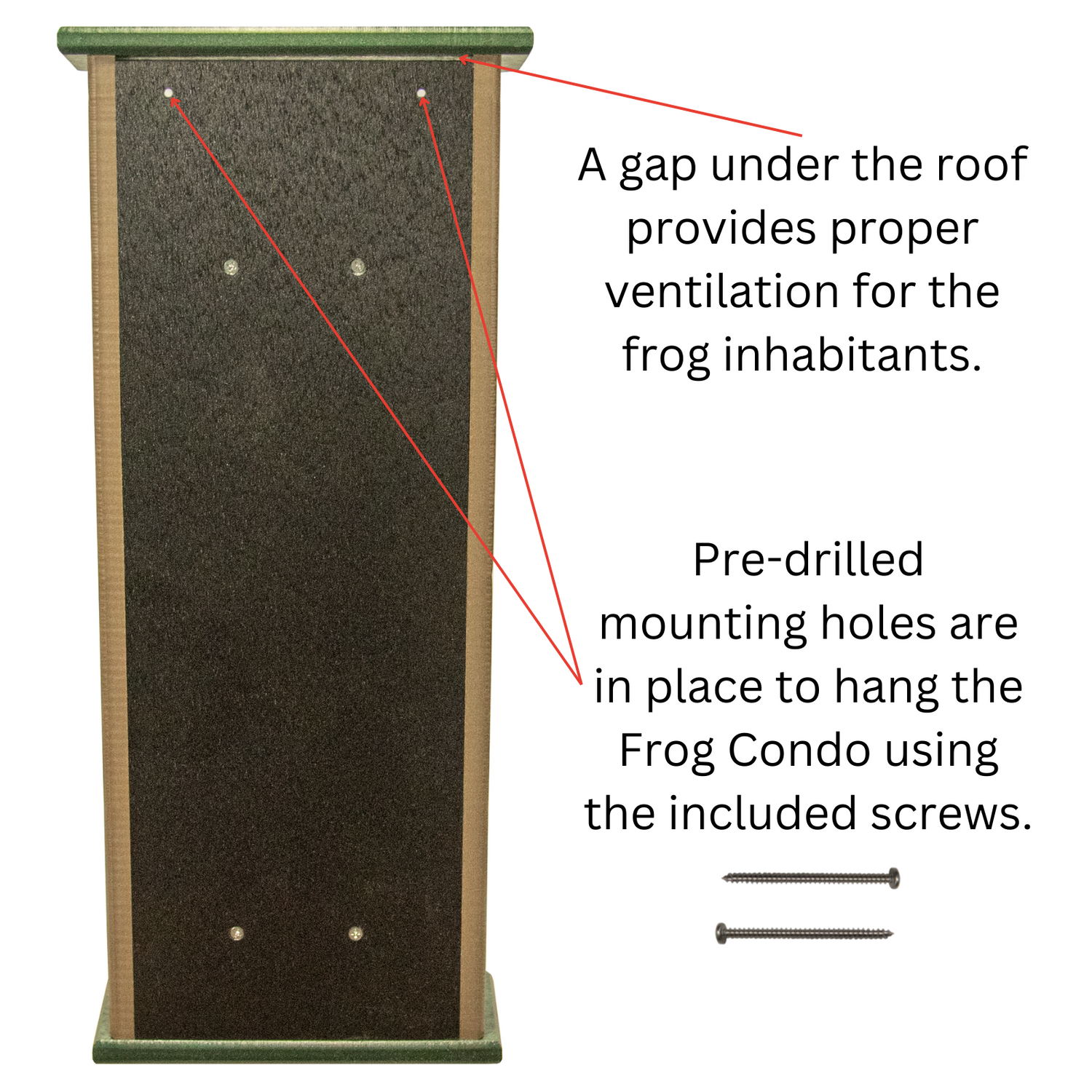 For the best results, position the house near an outdoor light source that attracts small insects at night, ensuring a late-night feast for your tree-dwelling friends. Watch as the tree frogs emerge right before dusk and retreat to their cozy home during the day. Multiple frogs can comfortably share this charming abode, making it a communal space for your local frog population. Crafted from recycled poly lumber material, the Lily Pad Condo is not only a luxurious sanctuary but also built to last. Say goodbye to worries about cracking, splitting, or fading – our condo is designed to withstand the test of time.