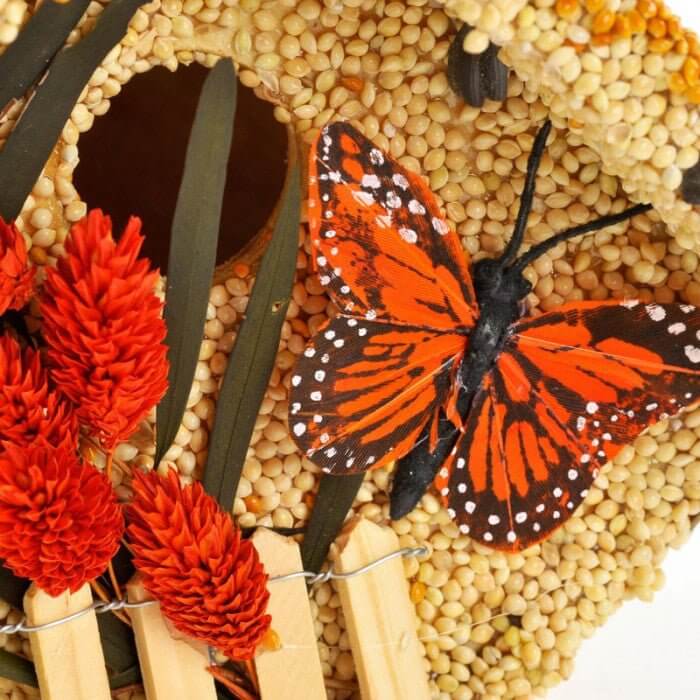 Darling wooden Wren house decorated with a variety of seed, butterflies and flowers. A delightful treat for your favorite backyard birds and a thoughtful gift for any bird-lover.