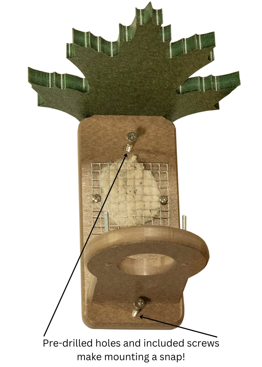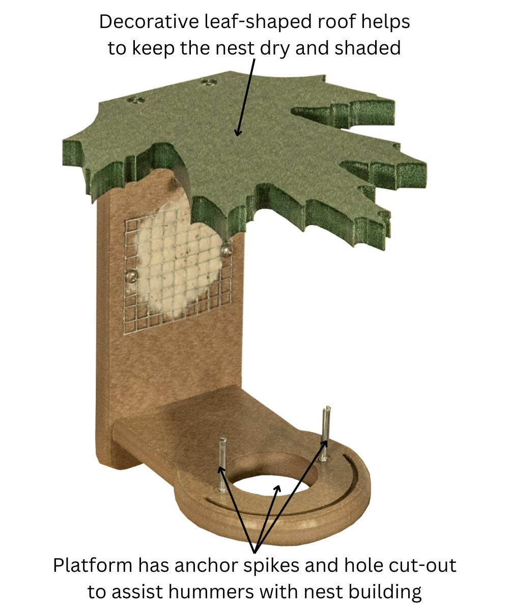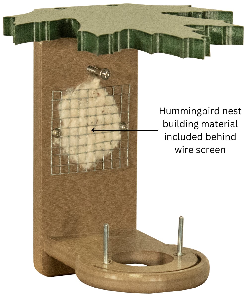 These beautiful hummingbird nest builders provide both a place and materials to build their nests. The leaf overhang provides protection from the weather while also making the nest builder blend in with the environment. The entire design of this nest builder was created with the needs and limitations of hummingbirds in mind. The handcrafted, poly lumber construction is a testament to the quality and resiliency of this nest builder. And to top it all off, these are made in the USA! Dimensions are 7.5"H x 6"W x 7"L.