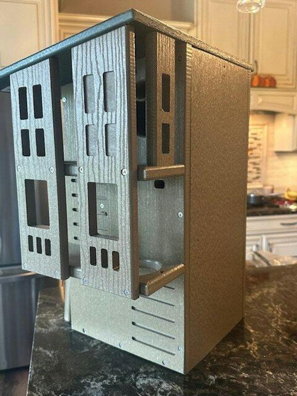 This house is made by JCS Wildlife with recycled poly lumber. The durability of the weather-resistant poly lumber makes our box tough to withstand weather conditions.