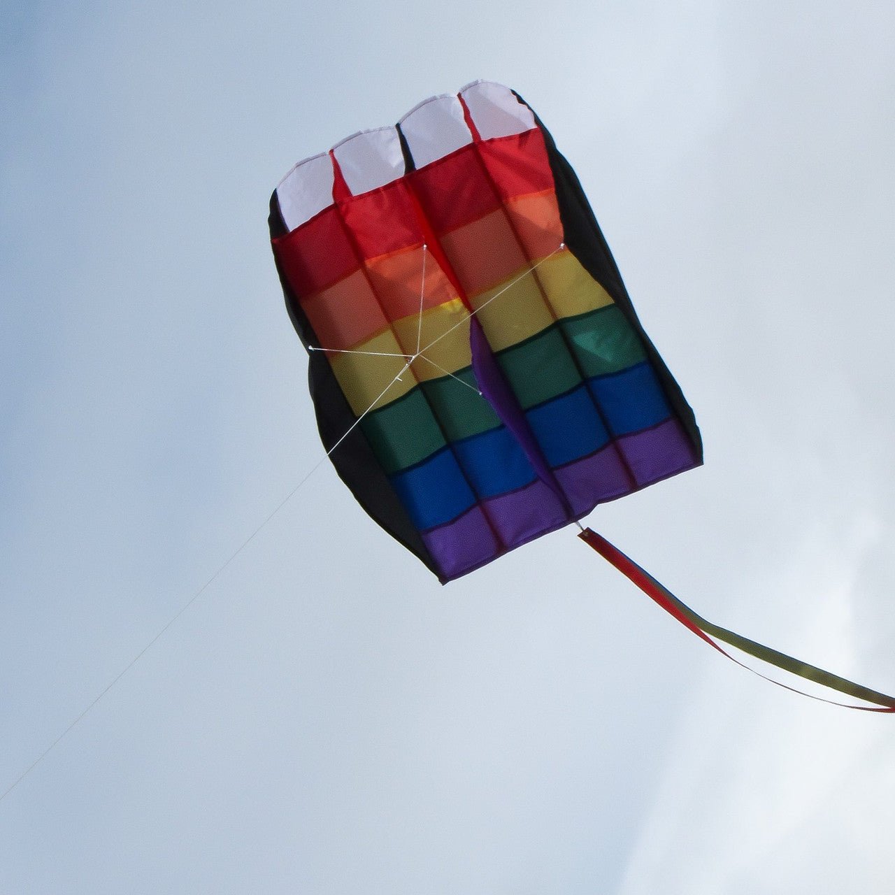 The In the Breeze 5.0 Rainbow Stripes Air Foil Kite has an aerodynamic cell structure inflated by wind. Air pressure keeps the sail open and holds the kite's shape while it flies. This style of kite is known to be a stable and easy flier. This is a great travel kite with no fiberglass spars to break and a cinch to pack up with the included bag. This is a single line rainbow kite, great for the novice to intermediate kite enthusiast.