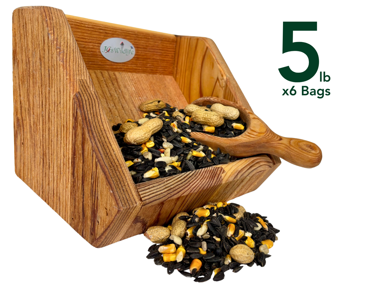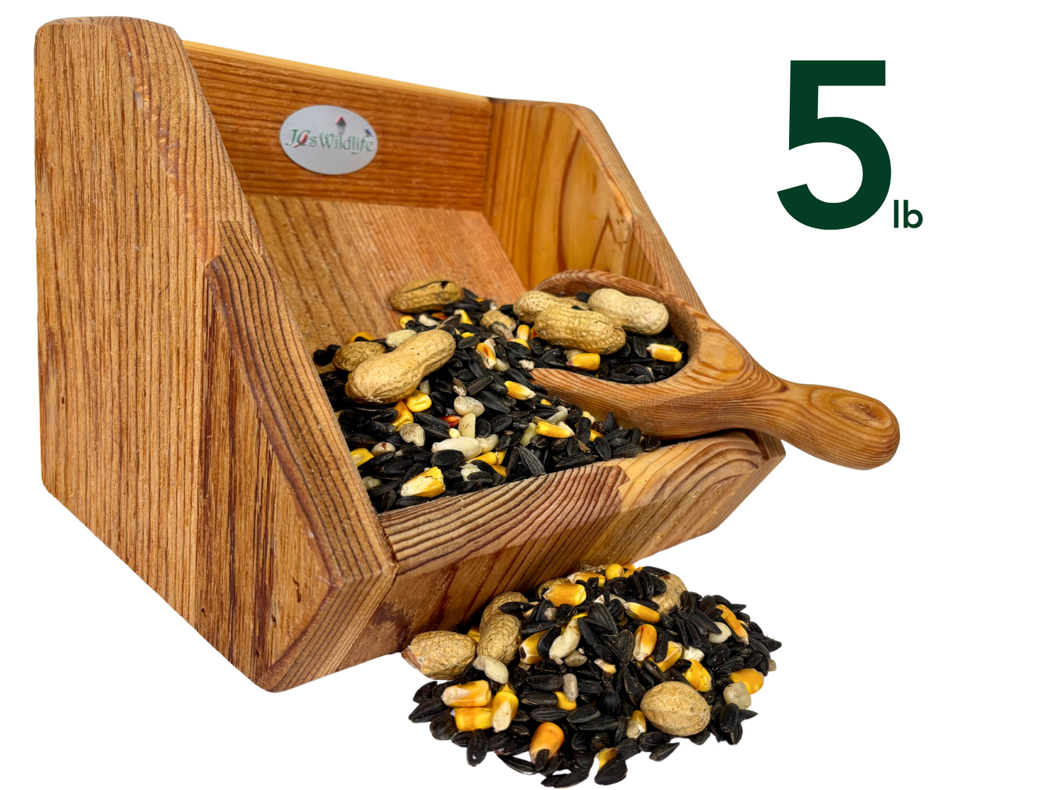 JQsWildlife wooden bird feeder overflowing with a five pound mix of black oil sunflower seeds corn and peanuts in a rustic setting