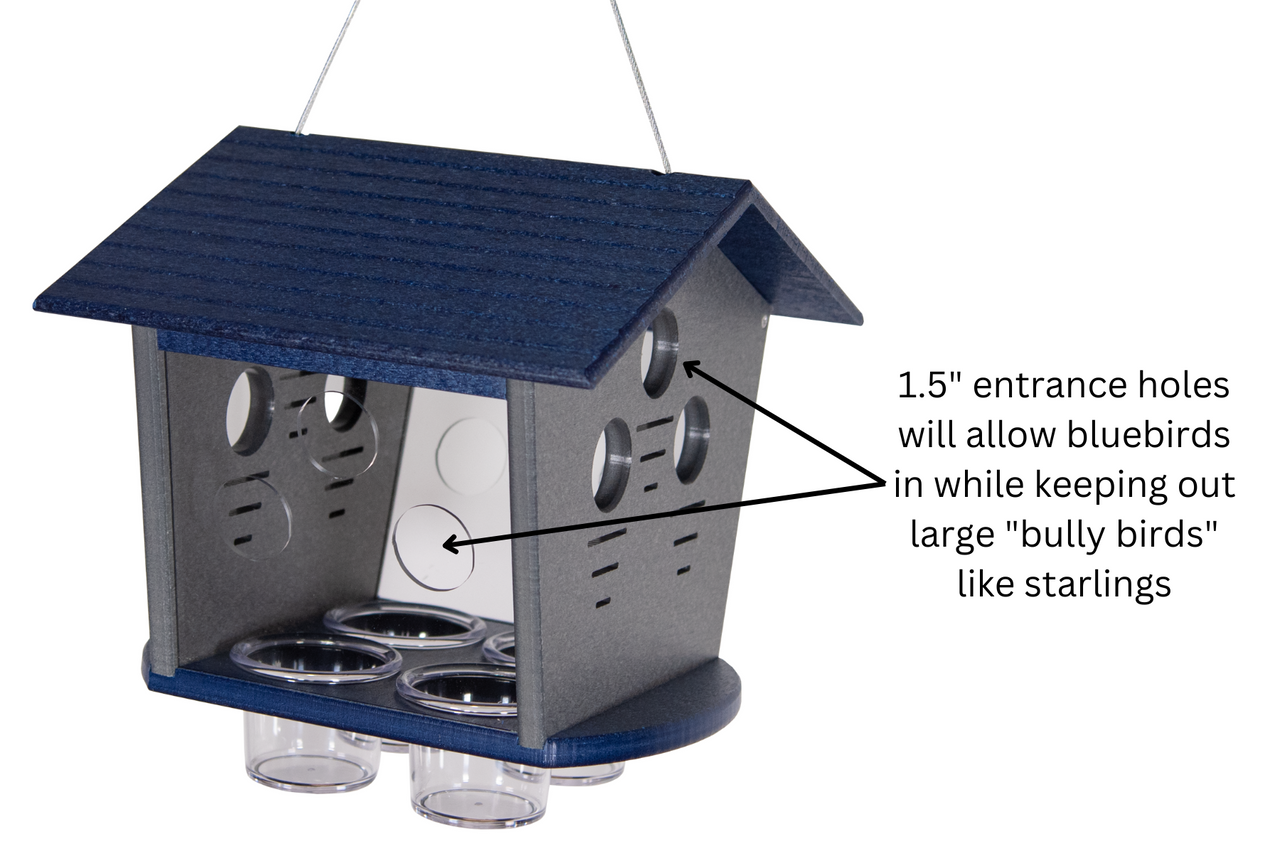 Give your bluebirds the best with the JCs Wildlife Ultimate Enclosed Bluebird Feeder! This enclosed feeder boasts 12 different 1.5" diameter entrance holes which are perfectly sized to accommodate Eastern and Western Bluebirds. Inside the feeder are 4 total cups perfect for your choice of dried mealworms. With this careful design, your bluebirds can feast while larger bully bird species like Starlings simply can't get inside to your mealworms. Our enclosed bluebird feeder also features an overhanging poly lumber roof which keeps your mealworms dry and safe from overhead messes. The roof of this feeder easily slides upward to refill the included mealworm cups, and the attached hanging cable means easy mounting. Acrylic front and back sides of this feeder also allow you to watch your beautiful bluebirds snacking without obstruction. Constructed with durable and sustainable recycled poly lumber and clear acrylic, your feeder is easy to clean and will stay looking wonderful in your garden for seasons to come.
