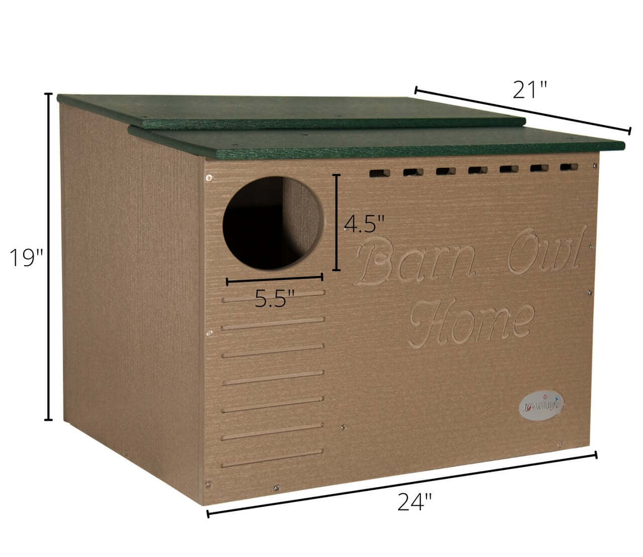 JCS Wildlife Poly Barn Owl Nesting Box made of eco-friendly recycled poly lumber with an elliptical entrance.