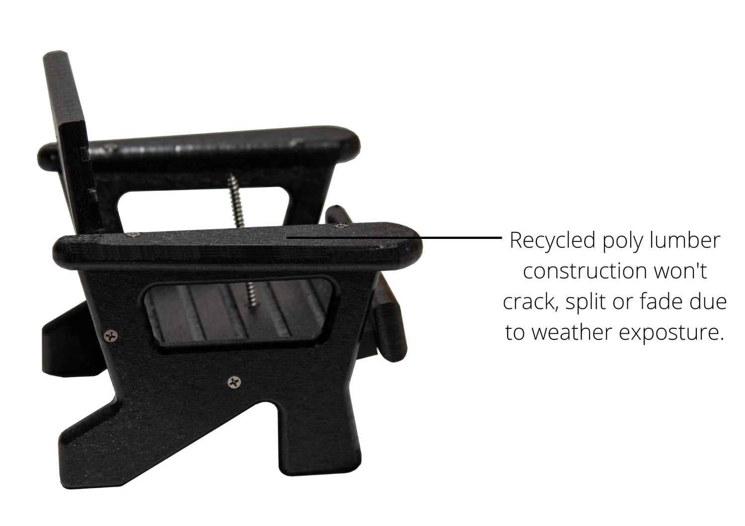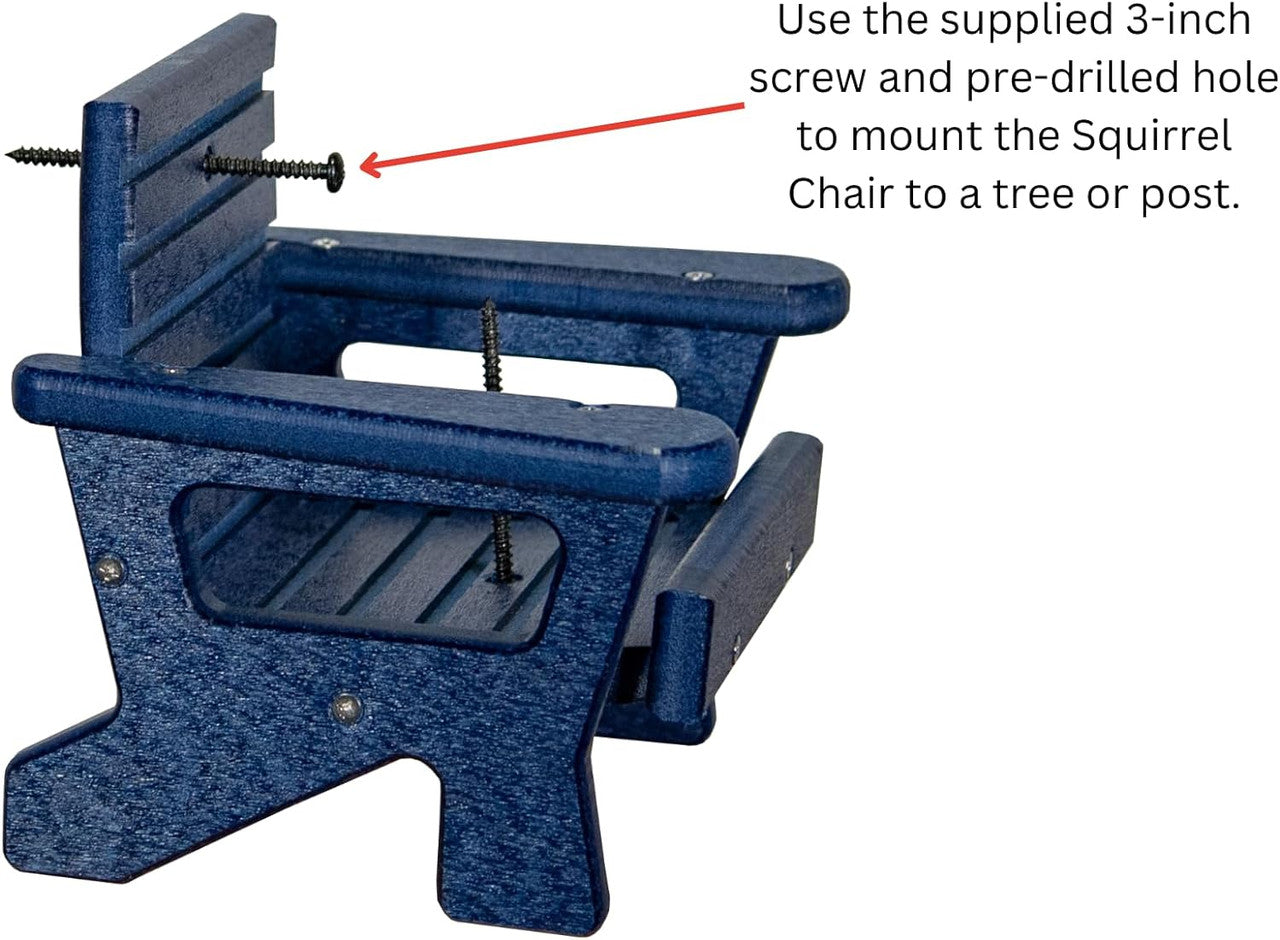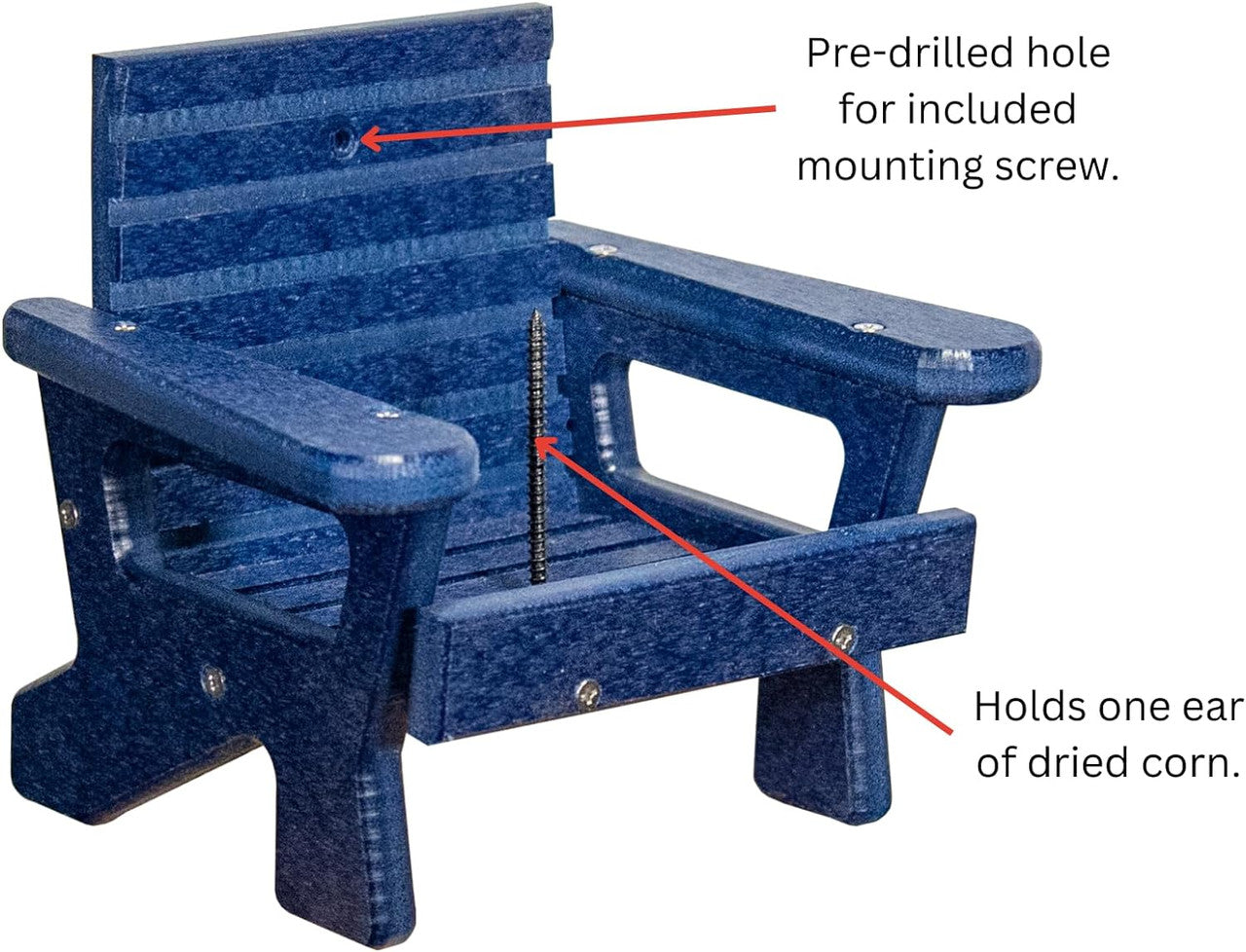 Give your squirrels a place to sit back and snack with the JCs Wildlife Squirrel Chair! Featuring an attached screw in the seat of the chair, this squirrel feeder holds one ear of corn easily and securely, perfect for your furry friends. Mount this squirrel corn feeder using the included mounting screw, and twist on a dried ear of corn for east feeding. Once filled, this corn cob feeder will look so cute in your garden! Watch the squirrels enjoy their new favorite snack spot, and they'll stay too busy to bother your bird feeders. We recommend mounting this house on a tree with plenty of squirrels, so they'll have easy access to your Squirrel Chair. Made with sustainable recycled poly lumber, this feeder will look great in your garden for seasons to come. This feeder is proudly made in our production shop located in Southern Indiana, USA! Specifications Overall Dimensions: 6.5" H x 8" W x 6.5" D Construction: Recycled Poly Lumber Country of Origin: Proudly Made in the USA!