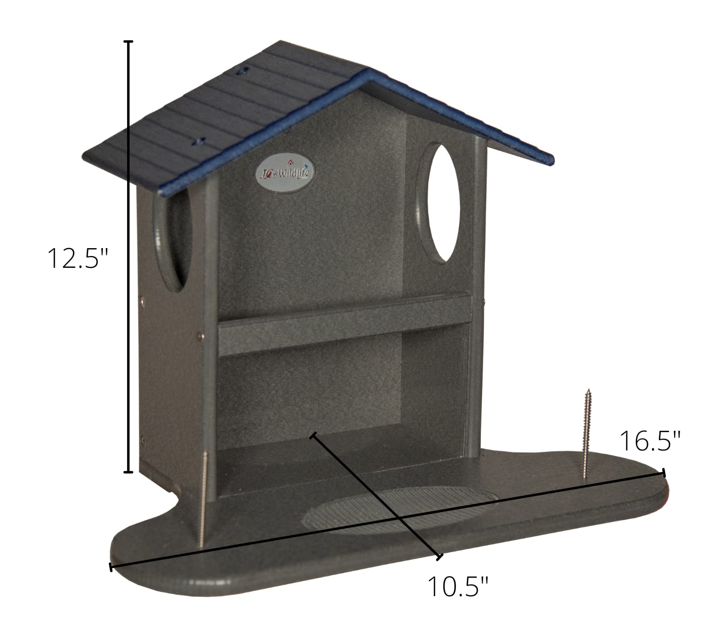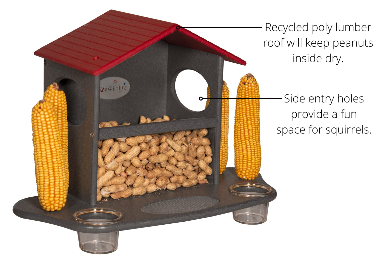 Invite your furry friends to dine at the JCs Wildlife Large Squirrel Snack Station! With 4 included metal stakes, two plastic water cups, an inner buffet area for peanuts, and a small area for fruits, your squirrels will be easily fed and away from your precious bird seed. Our Snack Station is constructed with durable and resilient eco-friendly recycled poly lumber, which is built to last through the seasons while looking sharp in your garden. This squirrel feeder also features a weather roof to keep your peanuts dry and free from spoilage due to moisture buildup. Your feeder will also come with two 3" mounting screws for easy installation to a squirrel friendly tree, and once your feeder is mounted, simply refill as needed to keep the snack station in business. Proudly made in our Southern Indiana production shop!