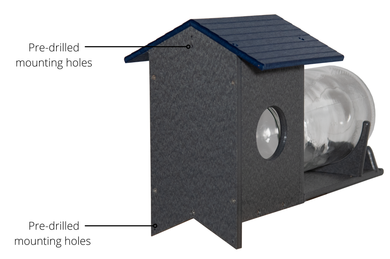 The Squirrel Under feeder is also easy to install, with four pre-drilled pilot holes, a mounting bracket packet, and two 3" mounting screws. Made with sustainable recycled poly lumber guaranteed not to fade, split, or crack due to weather, your Squirrel Under feeder will look great in your garden for seasons to come. Proudly made in the USA in our Southern Indiana production shop!