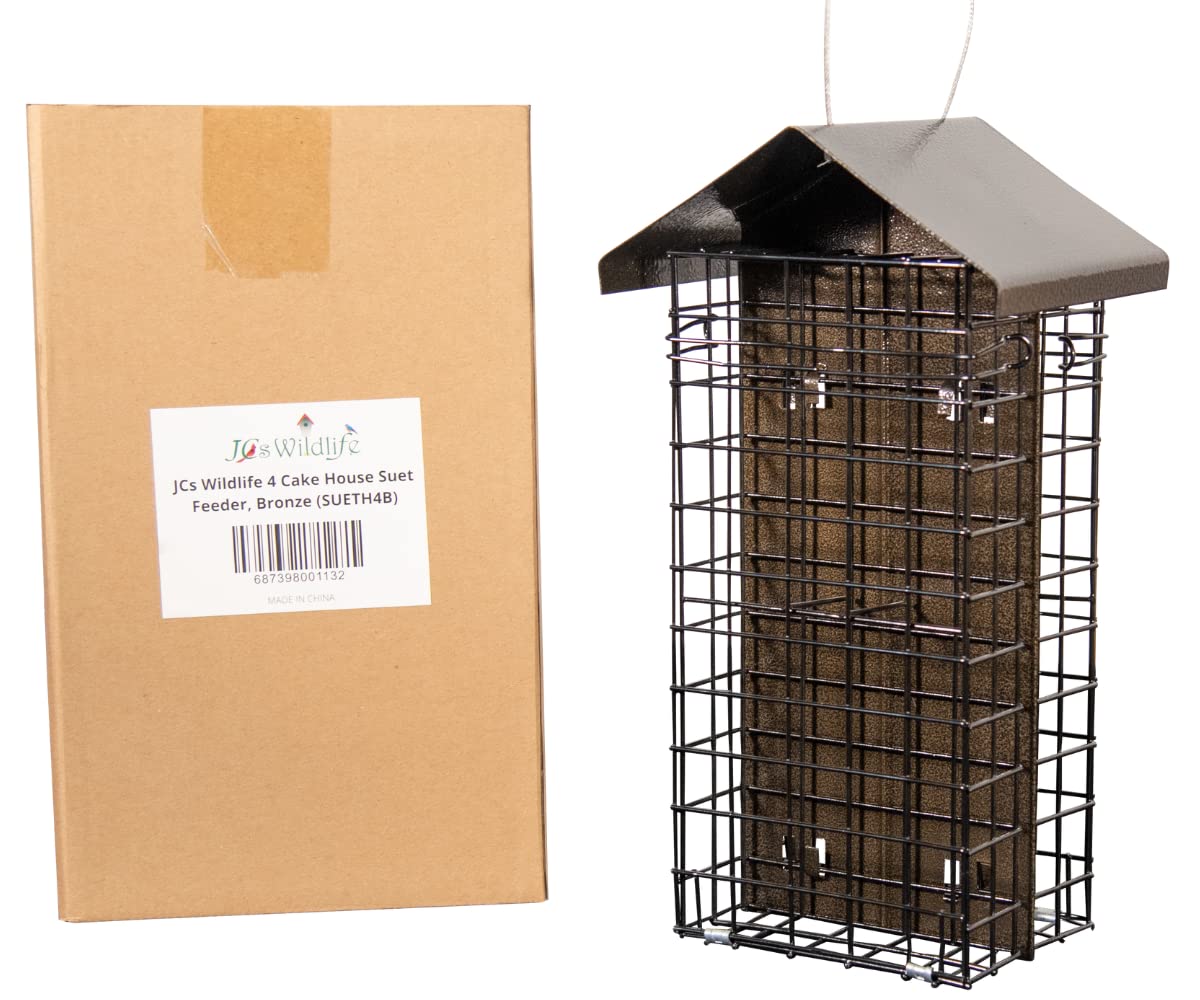 The JCs Wildlife Metal House Four Cake Suet Cage is a wonderful addition to your yard. With a beautiful textured roof and durable wire cage, the birds in your area will flock to your feeder. This quadruple suet cage features a wire cage that opens on both sides, and can fit four standard small suet cakes and small seed cakes comfortably. This cage feeder opens easily from both sides for easy refilling, and stays shut to avoid suet cakes falling out. The hammered roof also overhangs by 1" on both sides, which keeps your bird food drier and safer from precipitation, allowing your cakes to last longer.