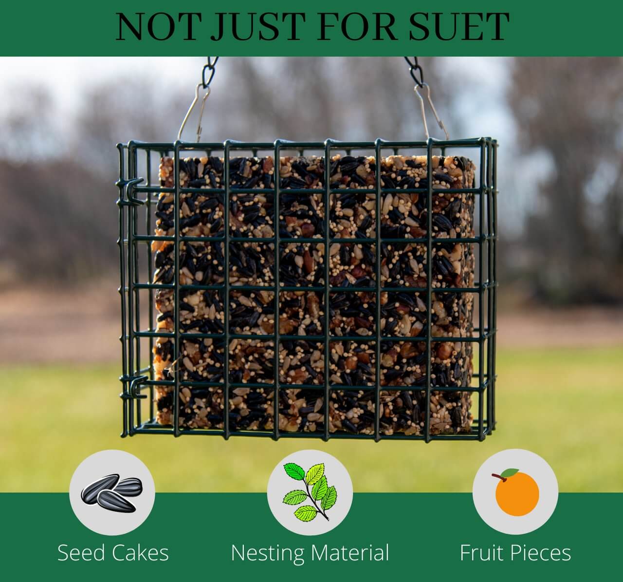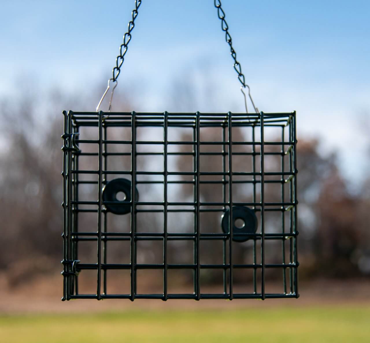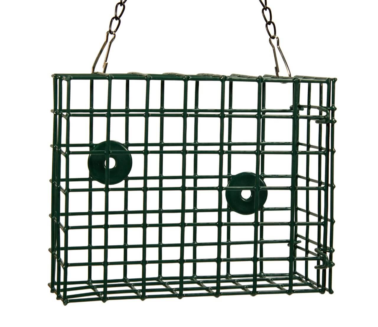 Feed your birds their favorite treats with the JCs Wildlife XL Suet Feeder Cage! This suet cage is designed to fit either one large suet cake or one large seed cake--a perfect amount for new or experienced birders, eager to feed their feathered friends. The sturdy PVC coated wire mesh of this feeder will last through the seasons while also providing perfect perching areas for the birds, and the easy side opening allows for quick refills and won't fall open. Our suet cage bird feeder can also be hung or mounted via the included hanging chain or two included mounting screws, ready for the perfect spot in your garden. Once mounted, simply open the side of the suet cage and insert your favorite suet or seed cake, and you are ready to feed your feathered friends. Product made in China.