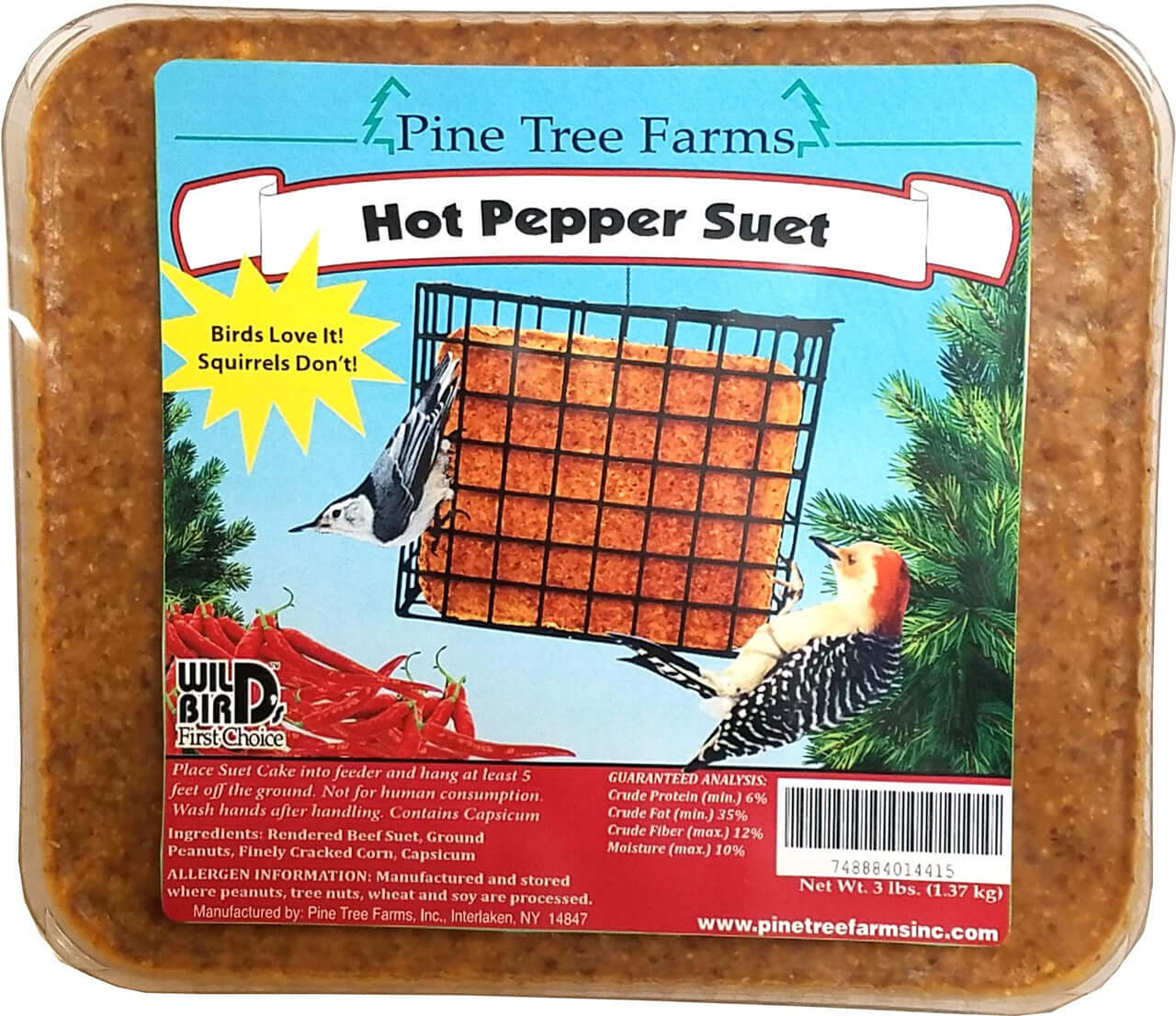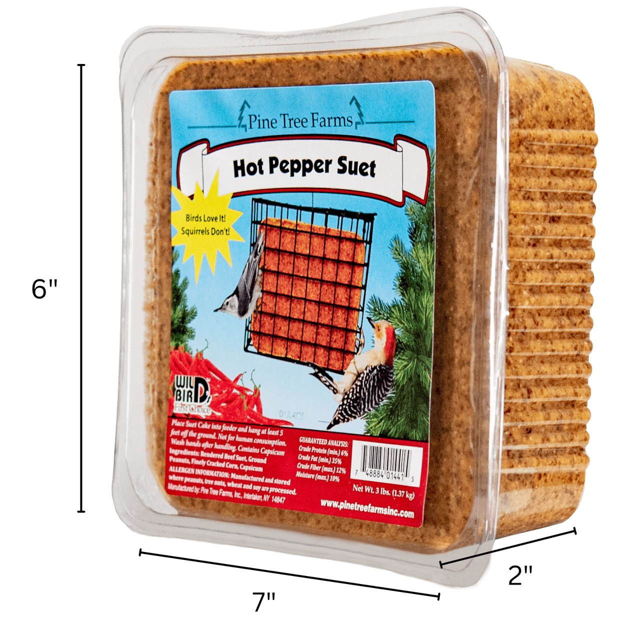 Same great recipe! New larger size! Birds love it! Squirrels Don't! This hot pepper suet cake contains rendered beef suet, ground peanuts, finely cracked corn and capsicum. Attracts a variety of birds and is a great source of energy. Hot pepper deters squirrels from eating the suet. Place suet cake into feeder and hang at least 5-feet off the ground. 3 pounds.