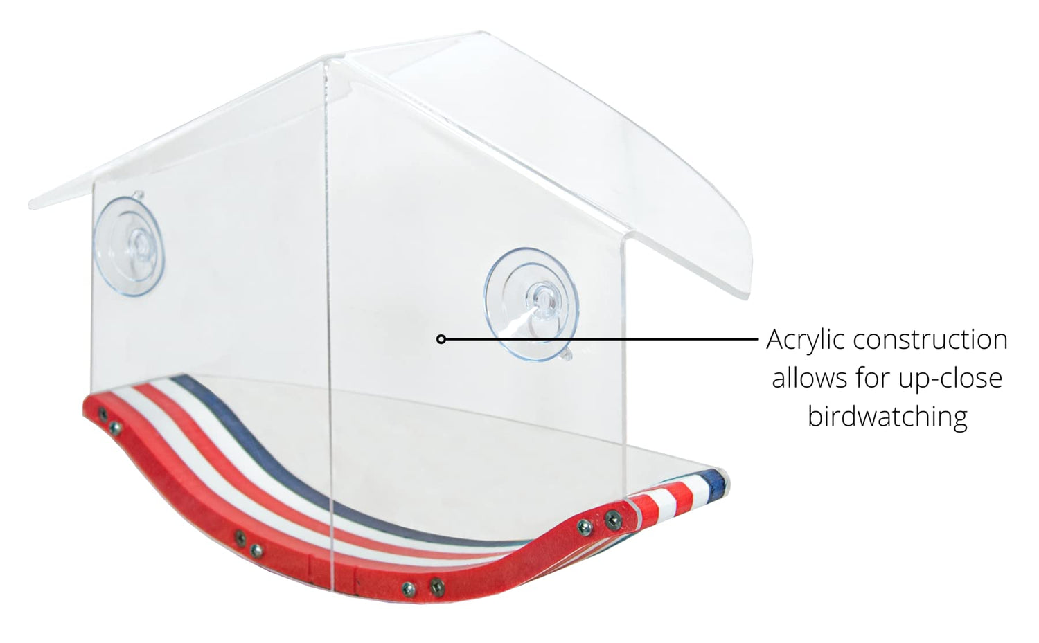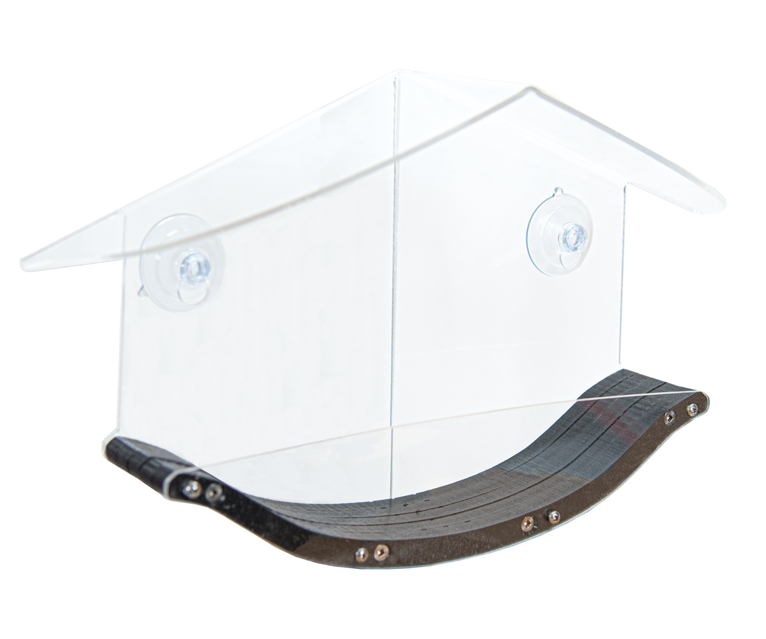 Show some style at your window with the JCs Wildlife Swoop Window Bird Feeder. Made with clear acrylic and sturdy eco-friendly recycled poly lumber, this window bird feeder is sure to look wonderful in your yard for seasons to come. Featuring an overhanging acrylic roof and small drainage holes in the bottom, your seed will stay safe from seed buildup and mold without obstructing the view of your favorite birds.