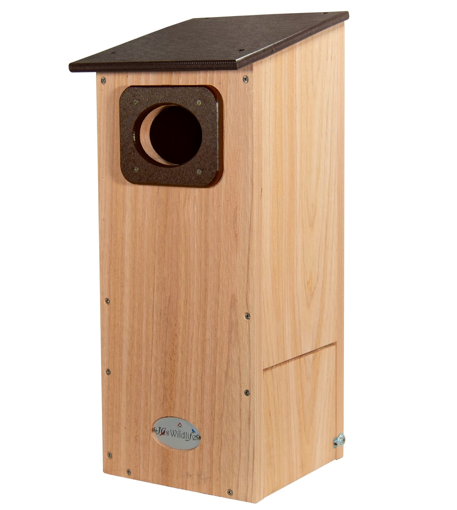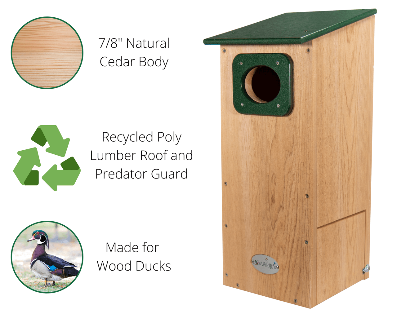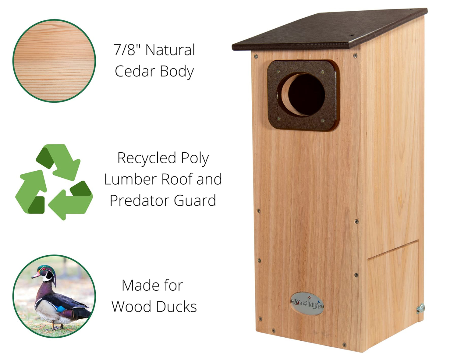 Welcome your feathered friends with the JCs Wildlife Cedar Wood Duck House! This cedar duck house is designed to be mounted on a pole in the water or at the water's edge in wetland areas for wood ducks as well as other cavity-nesting birds like kestrels, tree swallows, and great crested flycatchers. With a built in poly lumber predator guard, a 4" oval entrance hole, and a slanted overhanging poly lumber roof, this house is designed to safely and comfortably house wood ducks. The wood ducks living in this house will also stay safe from the elements as well as safe from predators like snakes or raccoons.