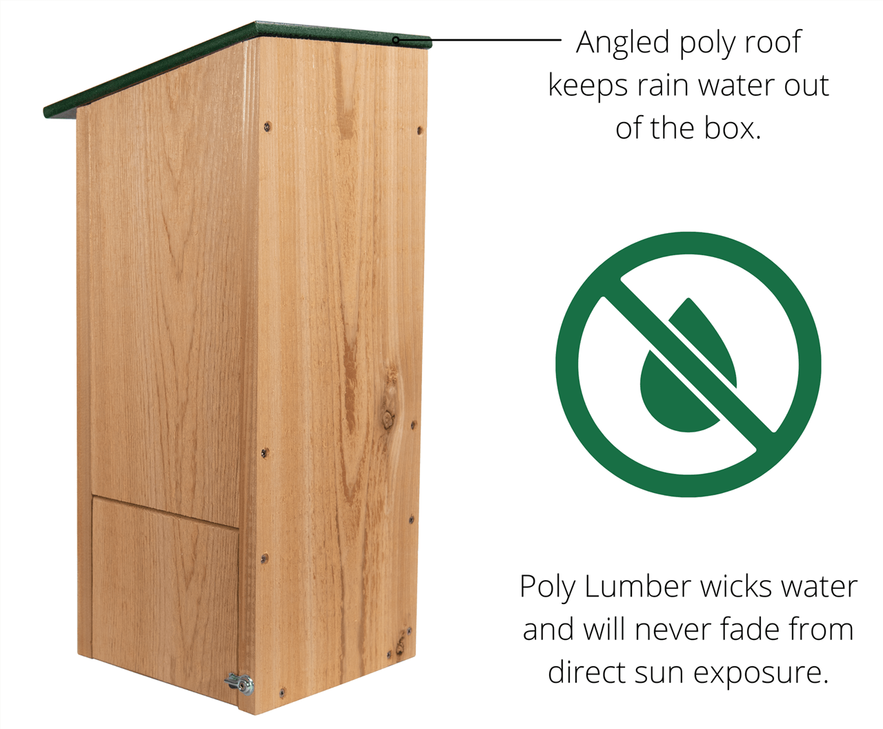 The cedar and eco-friendly recycled poly lumber construction of this Wood Duck House is naturally resistant to weather and insects, therefore no external treatment should be applied to the house.