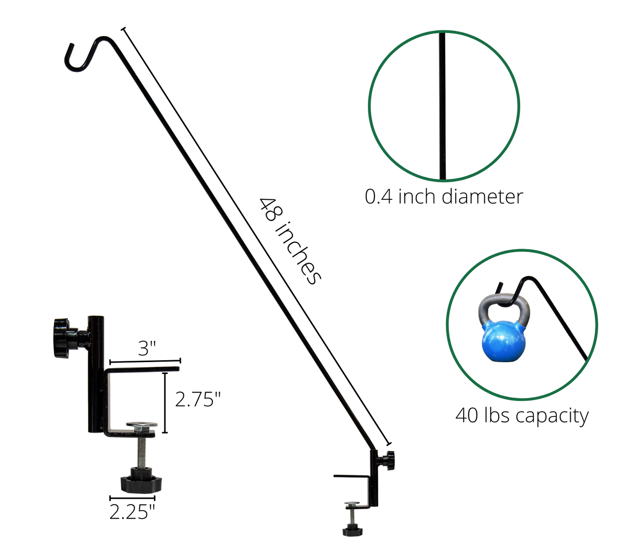 Showcase your favorite garden décor with the JCs Wildlife Deck Hook with Deck Clamp. With a sturdy powder coated metal hook that hangs at an angle from your railing, this deck hook will stay strong while sprucing up your outdoor space. This deck hook boasts a 40 pound weight limit, and can hold bird feeders, birdhouses, hanging plants, windchimes-- you name it! The JCs Wildlife Deck Hook easily clamps onto your deck with a sizable securing screw in the base, accommodating deck railings up to 2.5" wide. The 0.4" thick pole section of this deck hook slides easily into the clamp base, with a clear grip sleeve added to the bottom ensure a snug and secure fit. This powder coated deck hook will also stay safe against rust and wear at your patio while looking great for seasons to come. This deck hook also installs in no time--simply slide the clamp onto the railing and tighten the base knob to secure, insert the pole into the clamp, and tighten the side knob to prevent movement. Add the JCs Wildlife Deck Hook to your garden and highlight your favorite outdoor accessories! Product made in China.