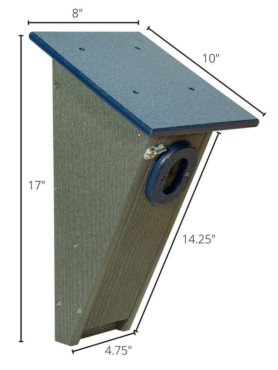 The Peterson nest box was developed by Dick Peterson of Brooklyn, MN. His somewhat unique design has been modified over the years and has become increasingly popular. We took that design and applied our own expertise, using our recycled poly lumber for the construction, meaning that the house will not crack, split, or fade!
