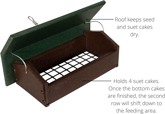 Construction: Poly Lumber Birds that use this feeder Woodpeckers, Scarlet Tanagers, Nuthatches, Jays, Bluebirds, Other Perching or Clinging Birds Seed or Feed Options Standard-Size Suet Cakes