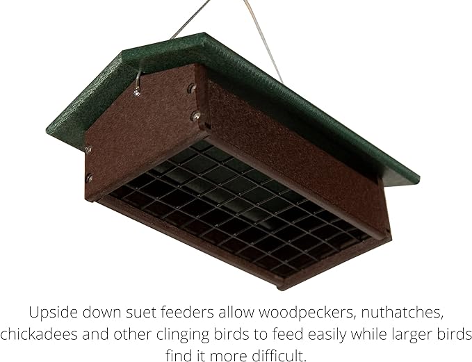 JCs Wildlife Recycled Poly Upside Down Double Suet Feeder. 5/8" Poly-lumber made from recycled plastic. Lifetime guarantee to never crack, split or fade. Holds 4 suet cakes (2 stacks of 2 standard-size suet cakes so you refill less often). Includes an 8 pack of Pine Tree Farms Premium Peanut Suet. Great for a wide variety of birds.