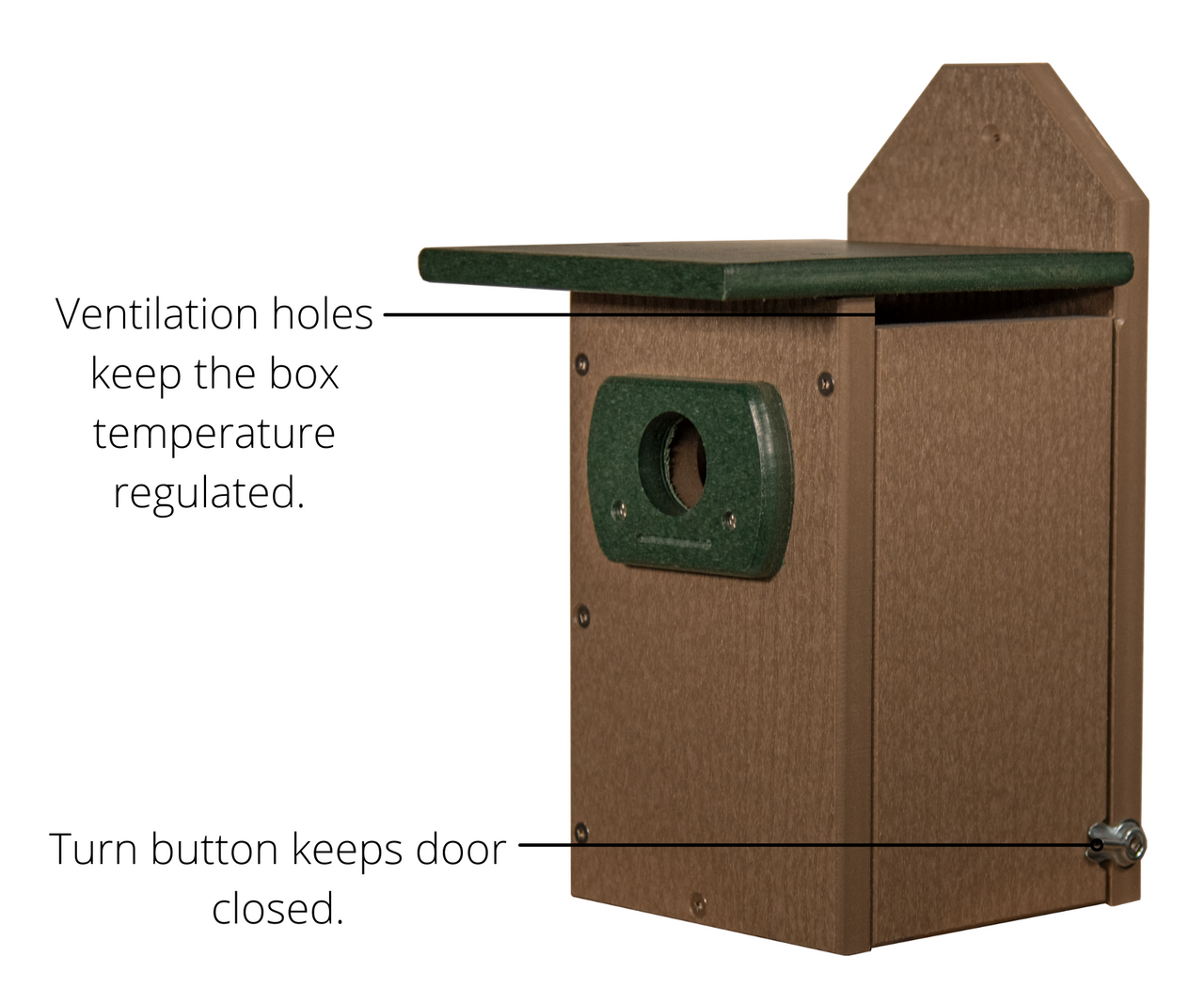 This beautiful hand-made Bluebird house is made by JCs Wildlife of recycled Poly Lumber. This box has been proven successful in being an ideal house for Bluebirds to call home. The open ventilation holes keep the box from overheating in the summer months. The 1.5" diameter entrance hole is large enough for Bluebirds, but not other bully birds or predators. It features all screwed construction using stainless steel screws and routed edges. The side-opening door offers easy access for cleaning. Simply mount the house by using the included mounting screw. This house will not crack, split or fade - it will look great for years to come. The colors are vibrant and UV protected. Dimensions are 6.25" W x 12" H x 8.5" D.