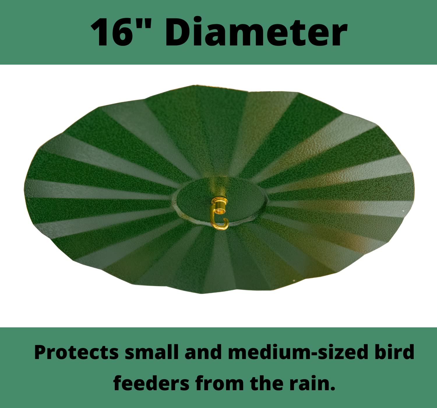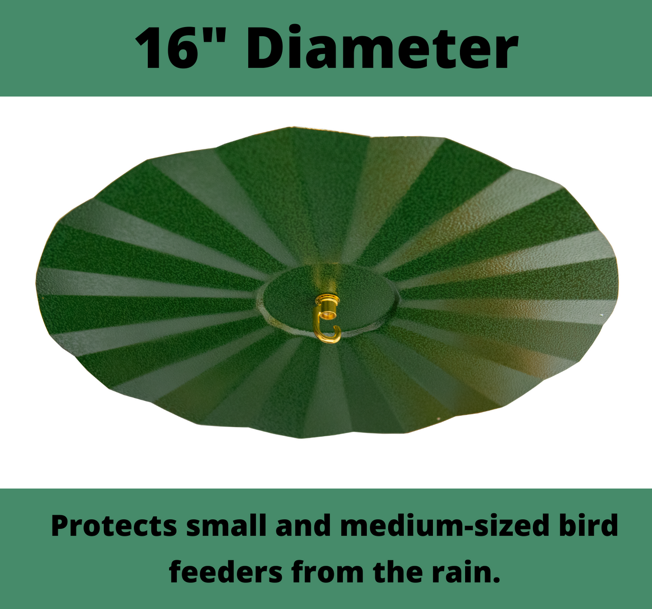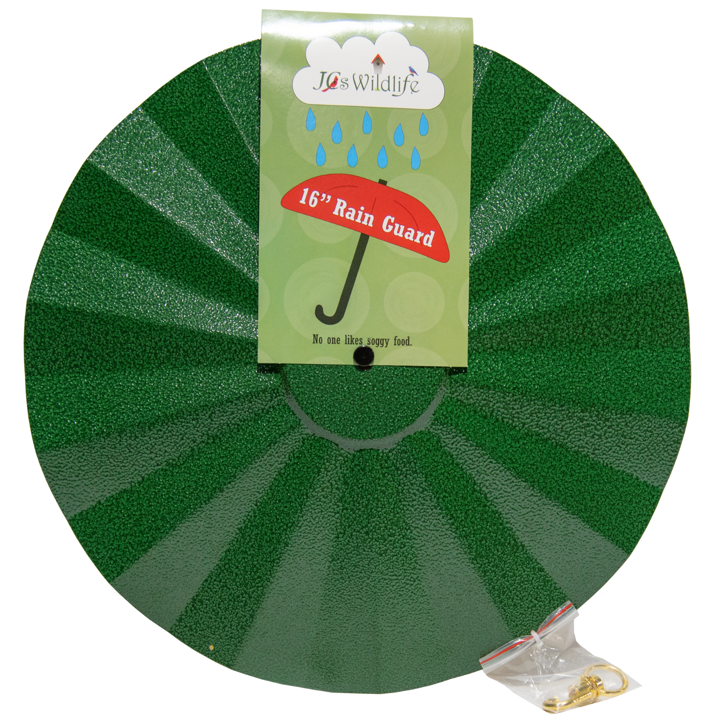 Protect your precious bird seed with the JCs Wildlife 16" Metal Rain Guard. Featuring a sturdy hook on the under side of the metal cover, hang your choice of bird seed cylinders and seed blocks closely underneath for maximum protection. This rain guard is treated with a protective powder coat paint which will stay vibrant in your garden for seasons to come--functionality with flair! Keep your bird seed dry, and your birds will be happy and healthy! Product manufactured in China.