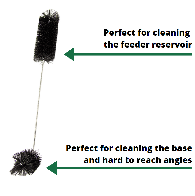 The long hummingbird brush is used primarily for cleaning the inside of the hummingbird feeder itself. The longer end of fuller brush is used for cleaning the reservoir, making sure to get the inside as clean as possible for your little friends. The shorter side will allow you to clean the base of the feeder as well as any harder to reach nooks and crannies. The smaller brush also has two sides to it, and will work well on the smaller, more detailed parts of your feeder. The more narrowed, pointed end is meant for cleaning the ports where your hummingbirds feed from. The flat side of the brush can be used for cleaning finer details on your hummingbird feeder such as the flowers, raised edges on the design, and more. This product is made in China.