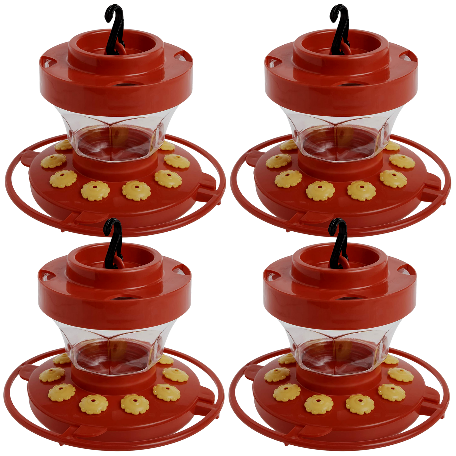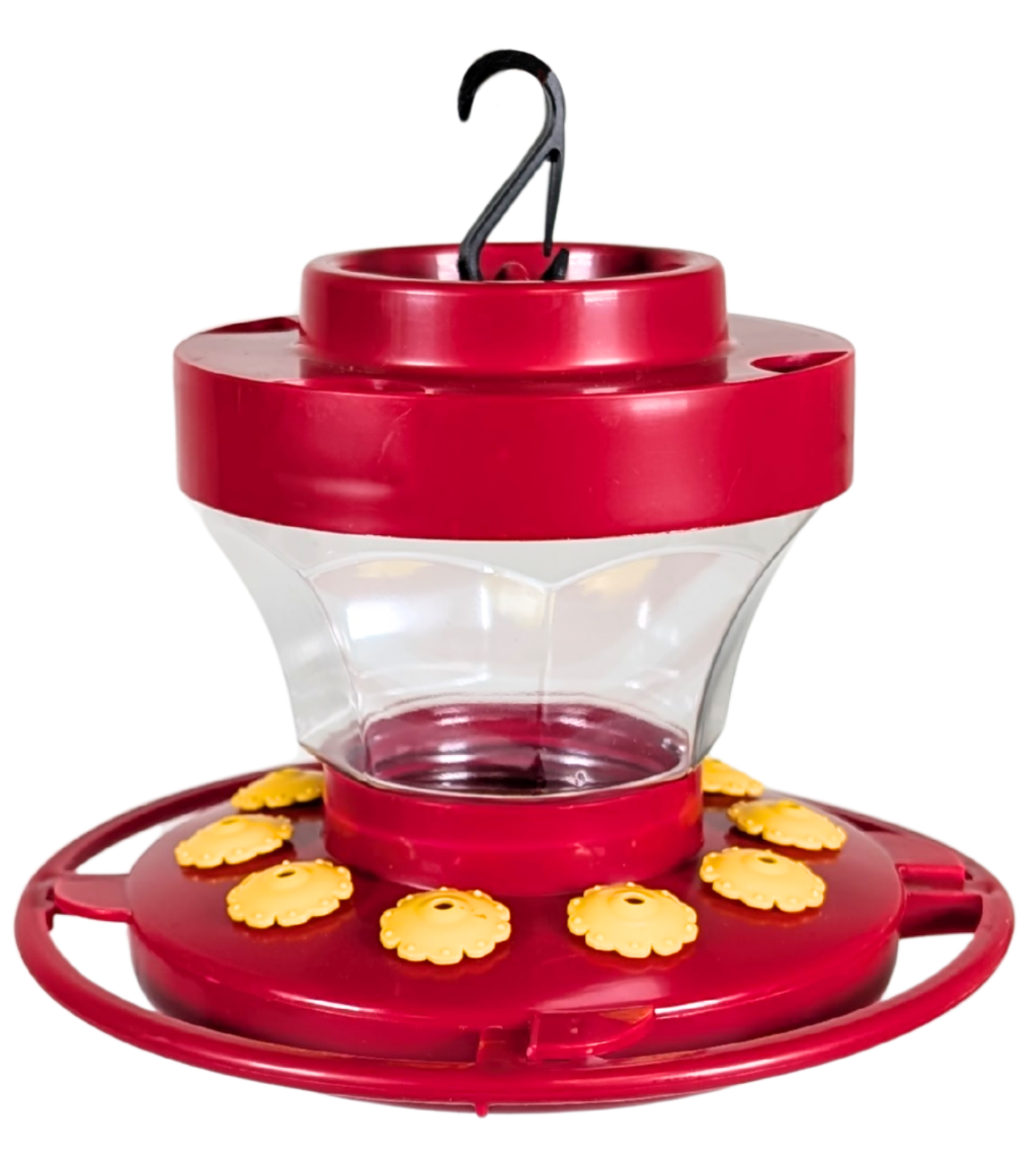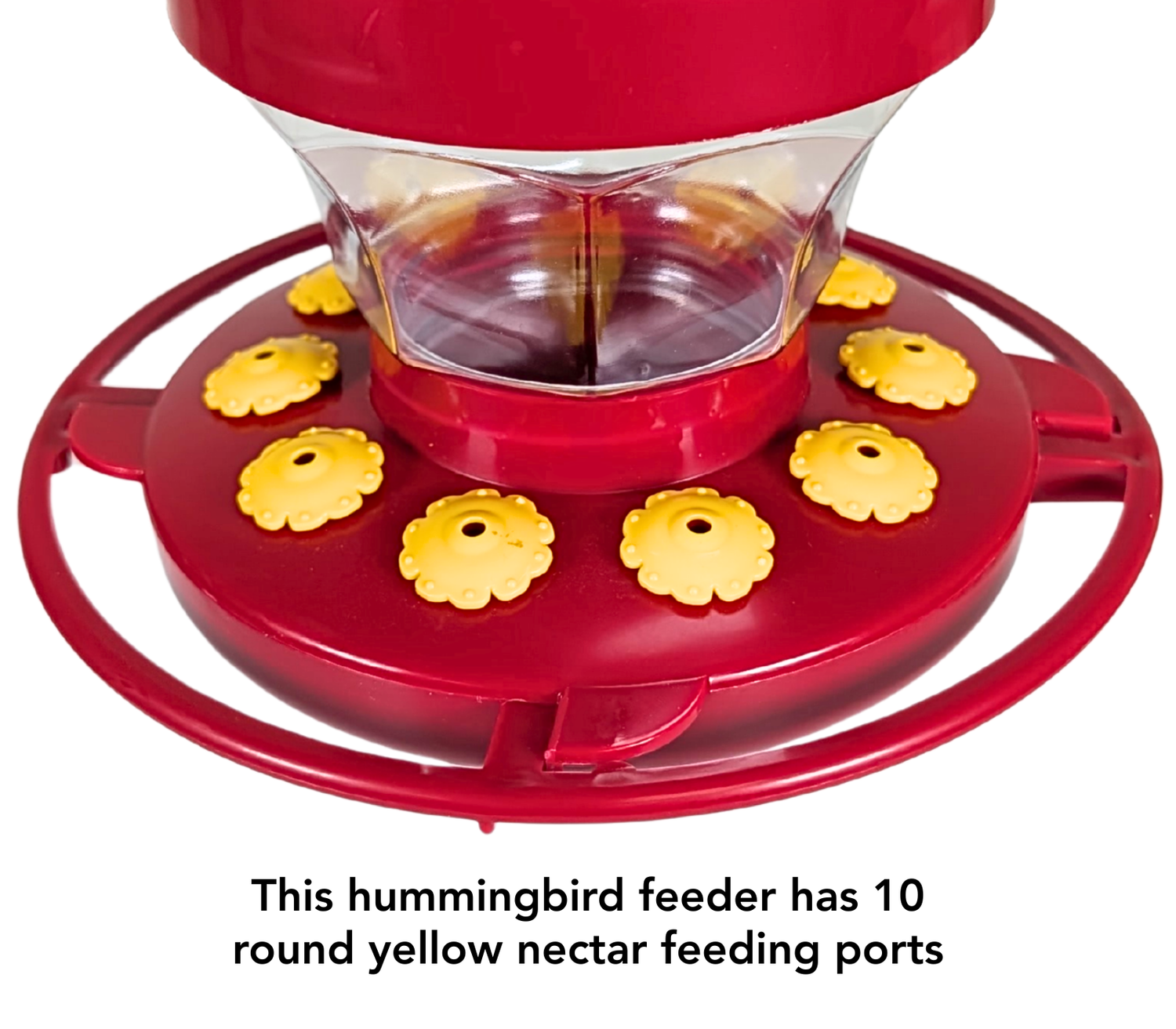 First Natures 16 oz. Hummingbird Flower Feeders red base with attractive yellow flowers really draws the birds and the yellow flowers discourage bees and wasps from entering the feeder. The perch provides the perfect position for birds to comfortably feed at any of the ten ports.