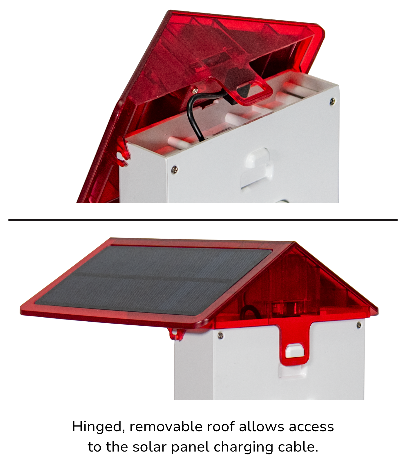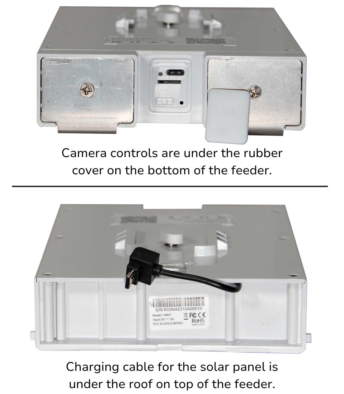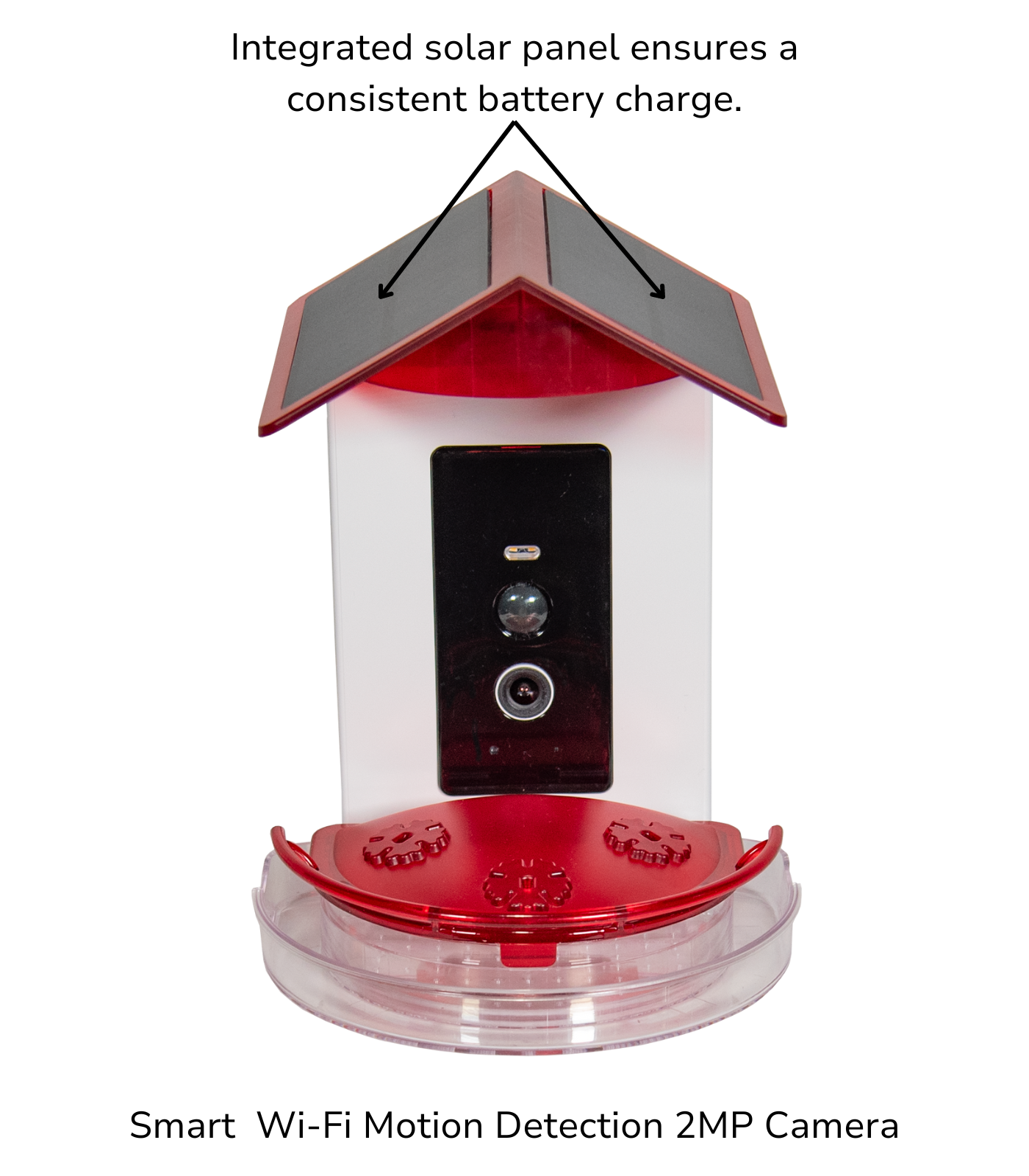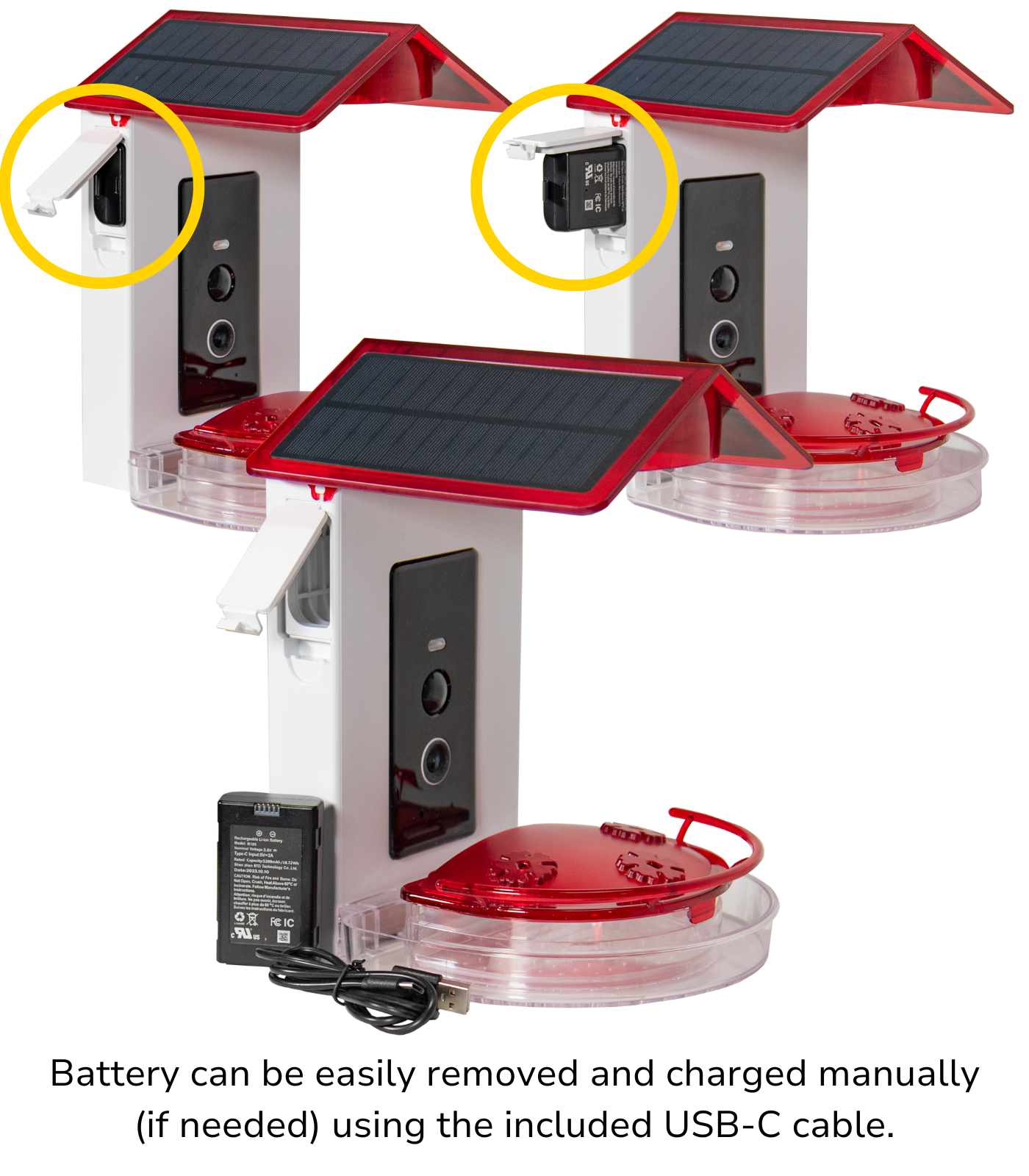 The “Smart” part of this hummingbird feeder is a wide-angle 2MP camera powered by an integrated solar panel in the roof which charges a robust 5,200 mAh Lithium-Ion battery. Should it be necessary, the battery is easily removed from the feeder housing and can be fully charged overnight with a standard, cell phone type USB-C cable. The camera is triggered by a motion detection sensor which operates day and night.