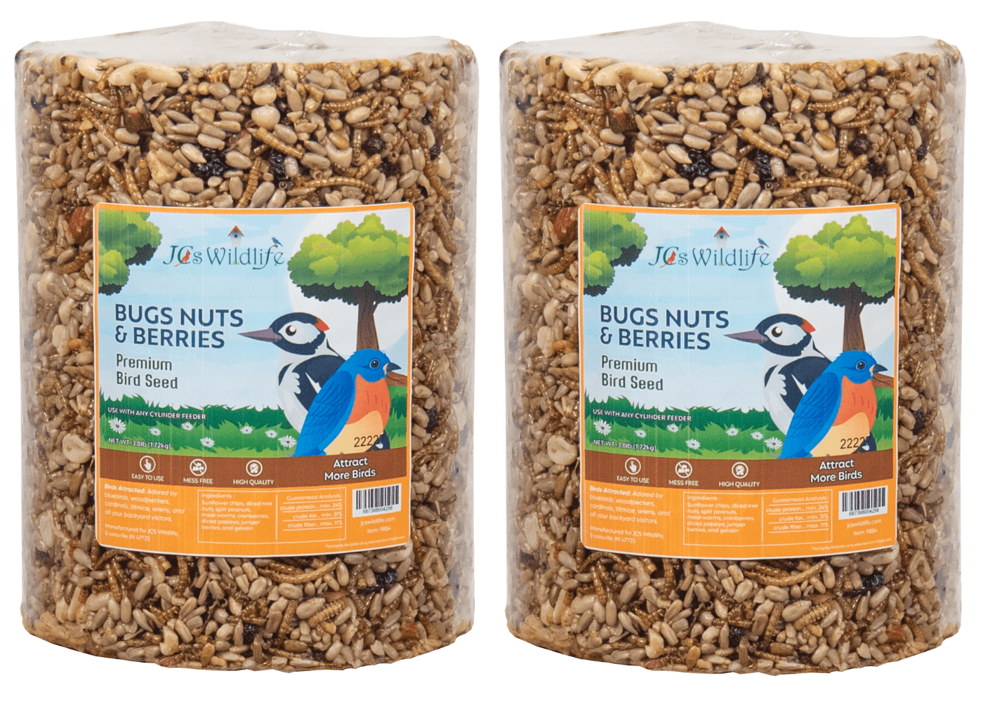 Birds adore the JCs Wildlife Bugs, Nuts, and Berries seed cylinders! One look, and you can see the high quality ingredients in this blend made by birders for birders right here in the midwest US. Since the blend does not include any hulls, there is vitually no waste to kill your grass or attract pests-- no mess, no fuss!