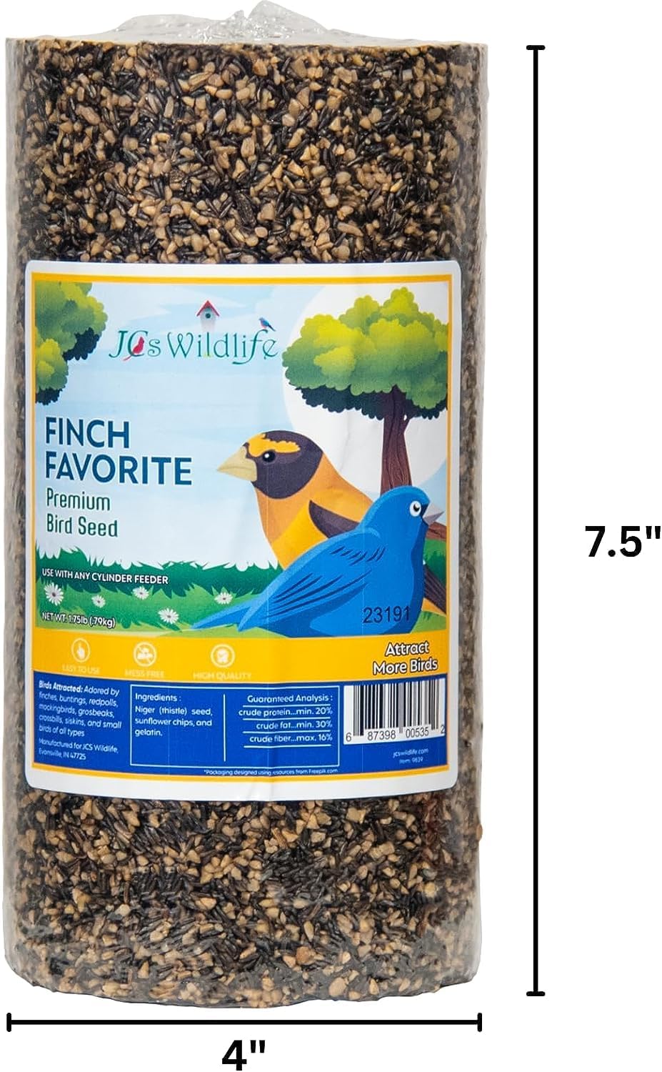 The JCs Wildlife Finch Favorite Premium Seed Cylinder is the first of its kind! It is a thistle seed cylinder made to attract primarily finches to your backyard! Thistle seeds do not germindate, decreasing the mess and waste hitting your lawn and without inviting unwanted pests or ingrown plants. This high-oil cylinder provides a much need boost of protein in a bird's diet and helps give them more energy all year round. Proudly made in the USA by birders for birders!
