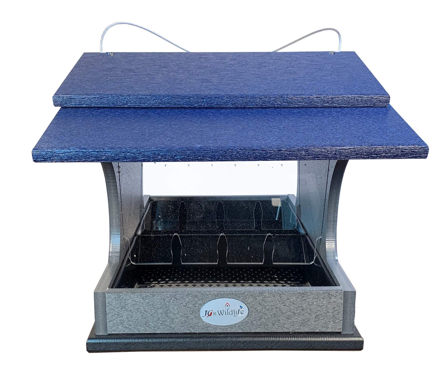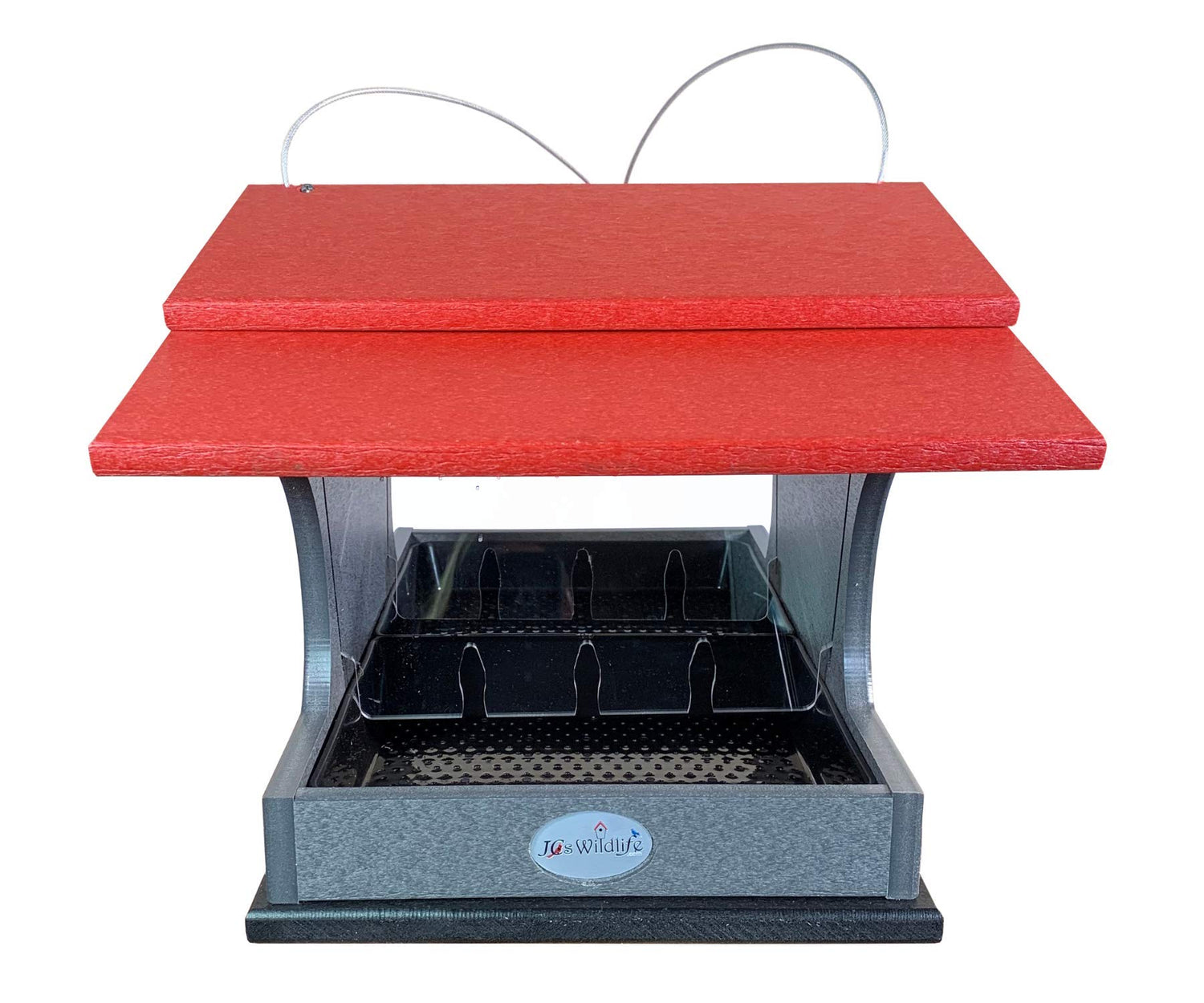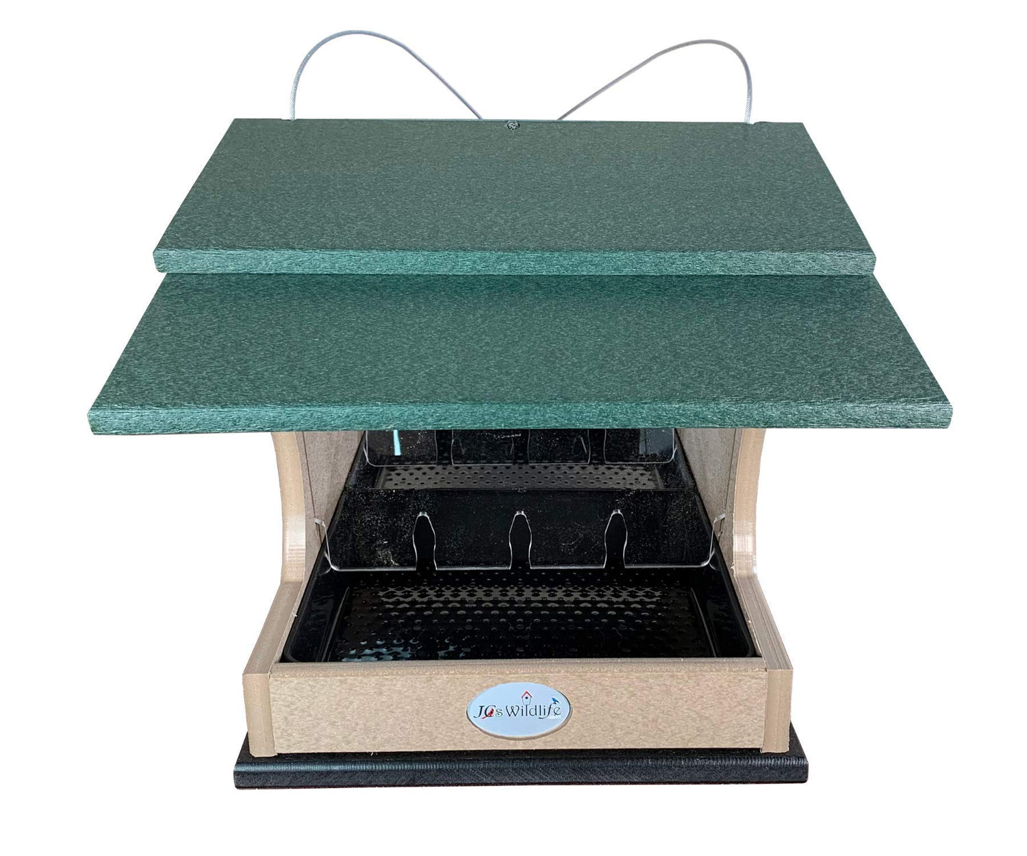 Get HOPPIN! This JCs Wildlife Large Poly Hopper Bird Feeder is the next feeder to add to your JCs Wildlife collection. The body of this hopper bird feeder is made out of recycled poly lumber material which will never crack, split or fade no matter the weather conditions. Constructed with all stainless steel screws to prevent rusting. The slotted acrylic sides help create a steady flow of bird seed filling into the removable seed tray so there will not be a build up of seed held hostage inside the hopper feeder. The acrylic screens and the seed tray are removable for easy cleaning. The top roof panel can be shifted aside to make refilling this feeder an easy task. Seed tray has small drainage holes to keep seed dry to resist molding. This JCs Wildlife Large Hopper Bird Feeder must be pole mounted from the bottom of the feeder. This feeder has been tested to hold up to 2 gallons of bird seed, making this our largest bird feeder to date!