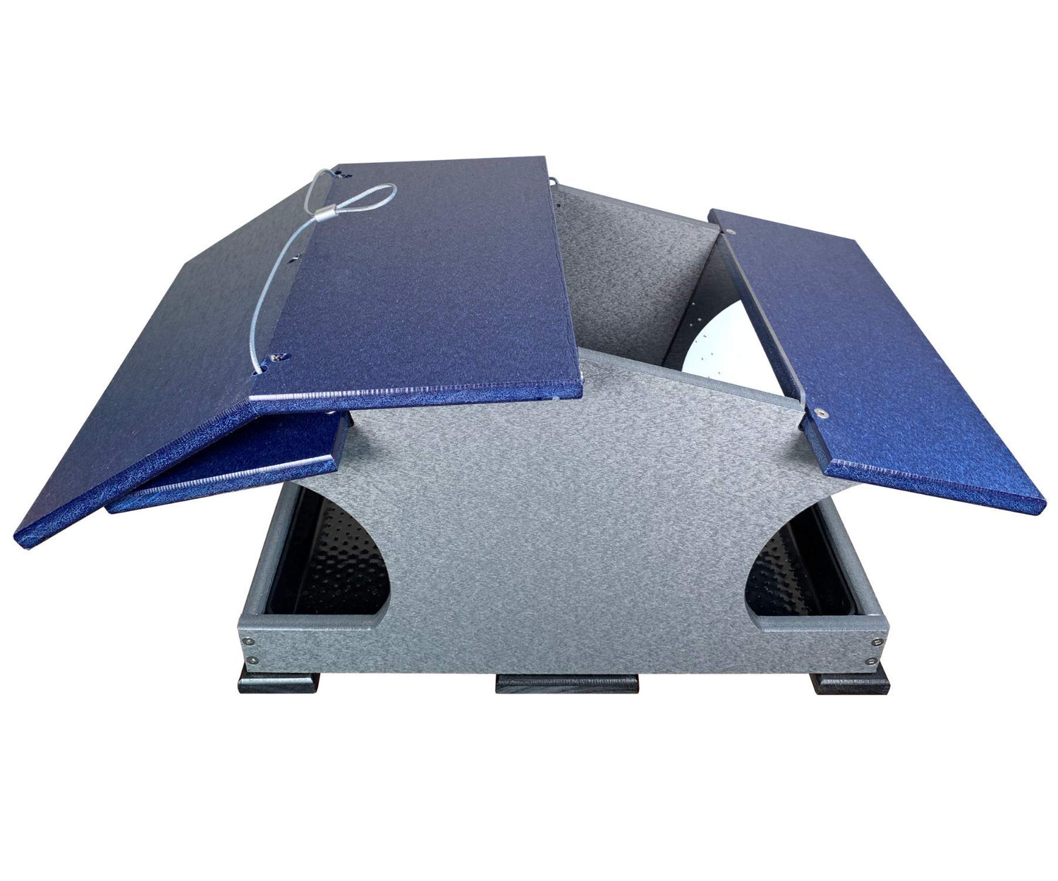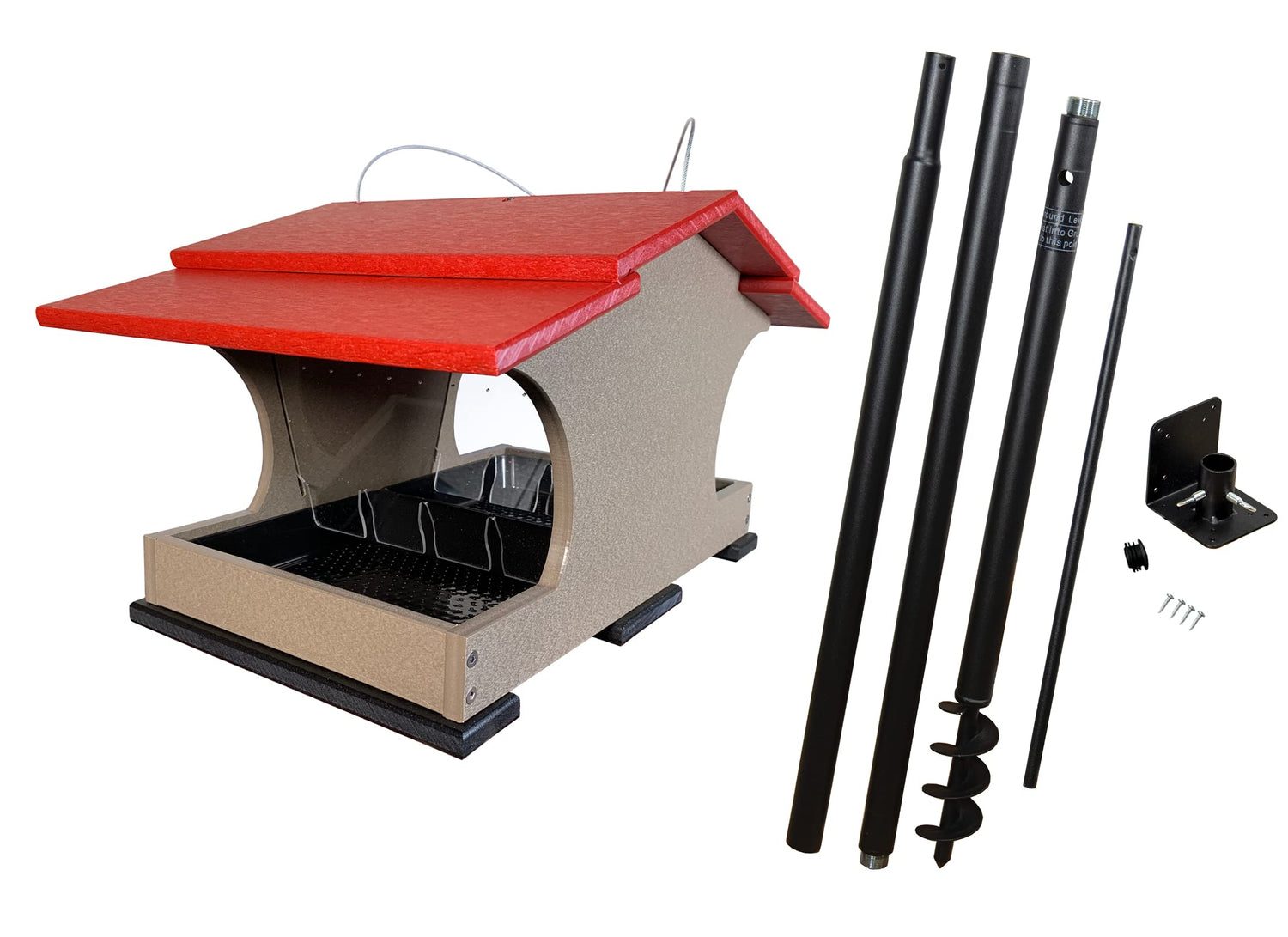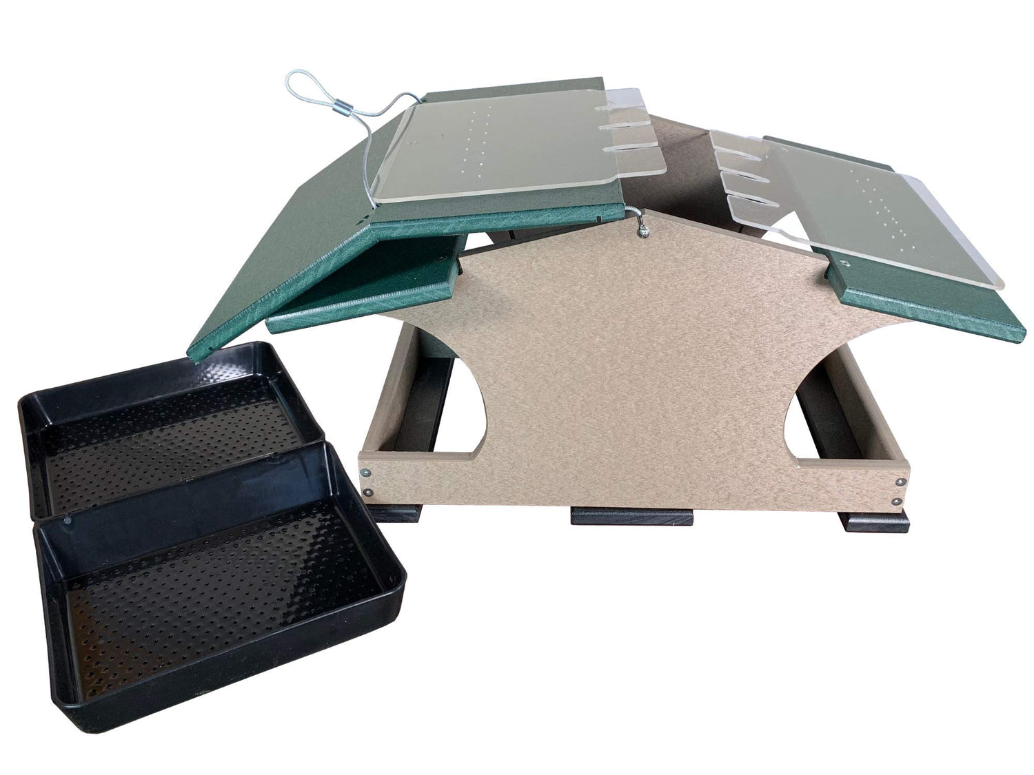 Get HOPPIN! This JCs Wildlife Large Poly Hopper Bird Feeder is the next feeder to add to your JCs Wildlife collection. The body of this hopper bird feeder is made out of recycled poly lumber material which will never crack, split or fade no matter the weather conditions. Constructed with all stainless steel screws to prevent rusting. The slotted acrylic sides help create a steady flow of bird seed filling into the removable seed tray so there will not be a build up of seed held hostage inside the hopper feeder. The acrylic screens and the seed tray are removable for easy cleaning. The top roof panel can be shifted aside to make refilling this feeder an easy task. Seed tray has small drainage holes to keep seed dry to resist molding. This JCs Wildlife Large Hopper Bird Feeder must be pole mounted from the bottom of the feeder. This feeder has been tested to hold up to 2 gallons of bird seed, making this our largest bird feeder to date!