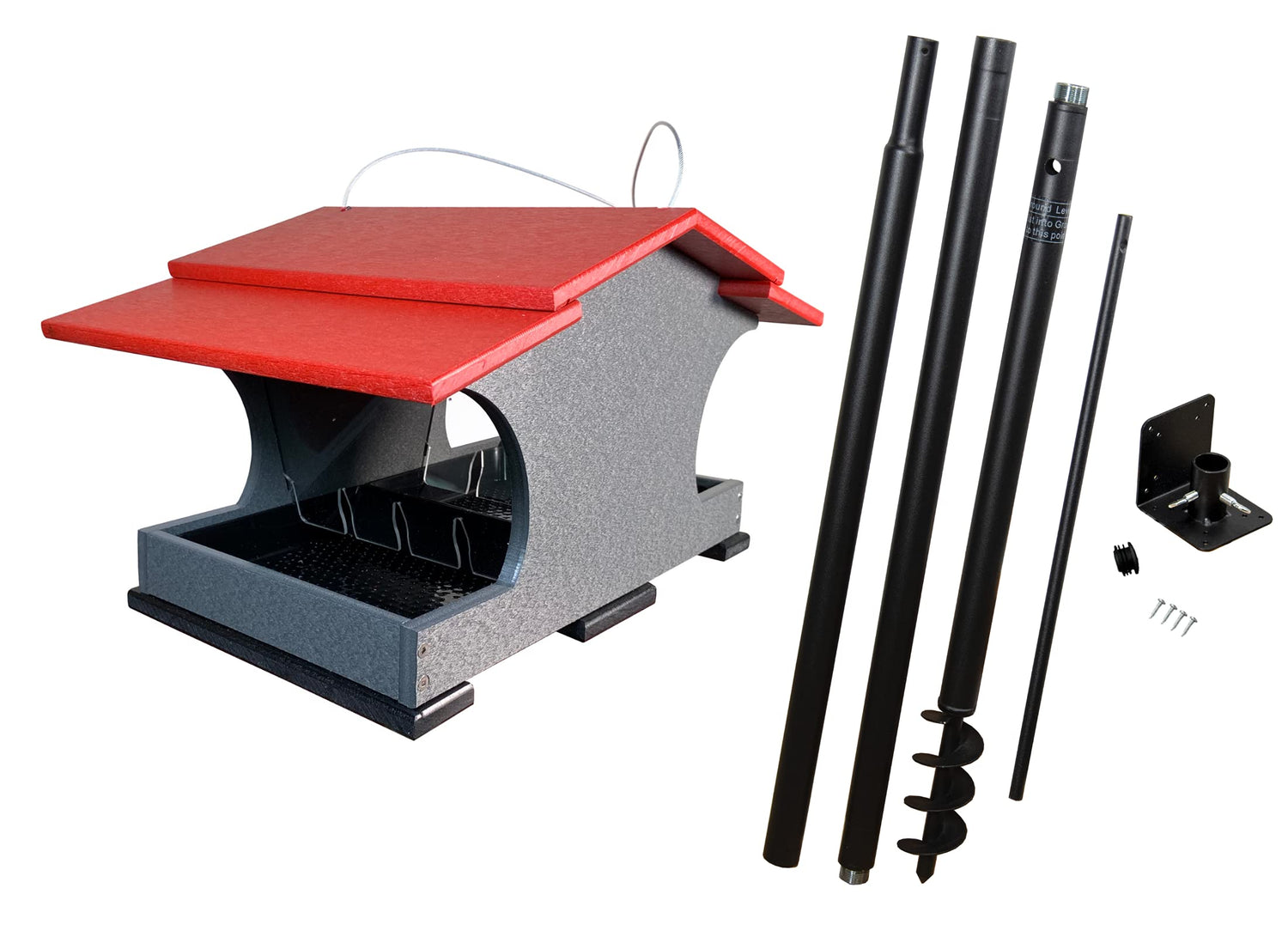 Universal Pole Kit by Squirrel Stopper: This pole features a sturdy, rust-resistant design, sure to hold up to even the largest and heaviest birdhouses and bird feeders. The three sections attach easily and the included heavy-duty auger is the same style made popular by the original Squirrel Stopper Pole System. The threaded joints help make this pole stronger than the traditional twist lock mechanism. The Universal Pole Kit is innovative in design, with a 1 1/4" diameter that tapers to the "universal" 1 inch diameter top. The included universal mounting flange allows for an object to be mounted on top or on the side of the flange. If the side mount is used, a plug is included to stop water from entering the pole from the open top mount. This pole stands about 5' tall when installed. This is not a squirrel-proof pole.