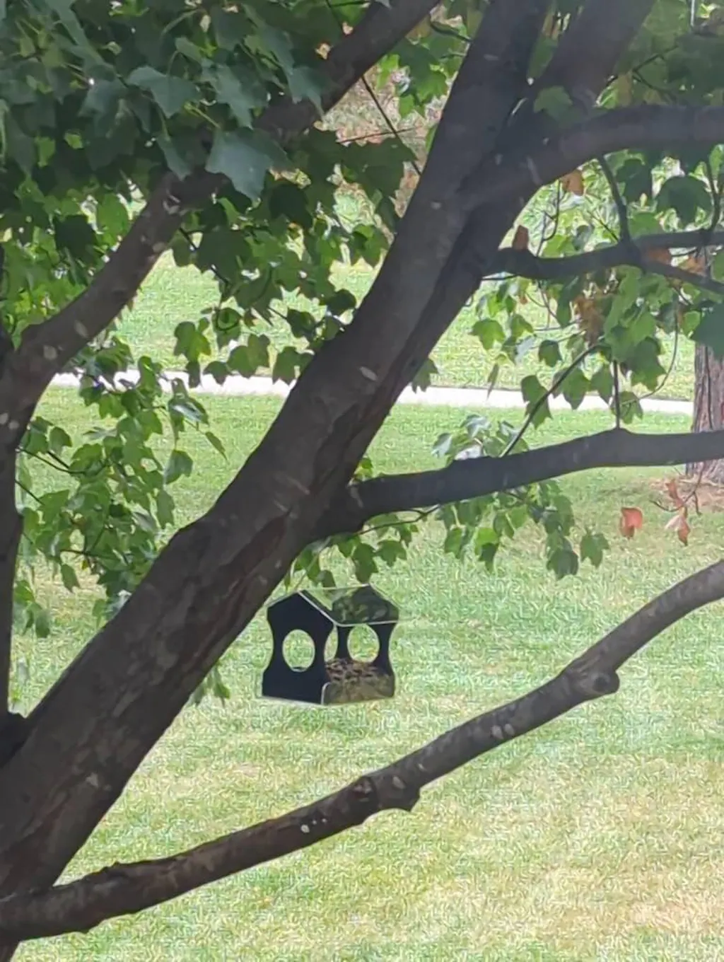 The handmade hanging bird feeder allows you to enjoy watching the birds you love up close - including Cardinals, Bluebirds, Titmice, and Finches.