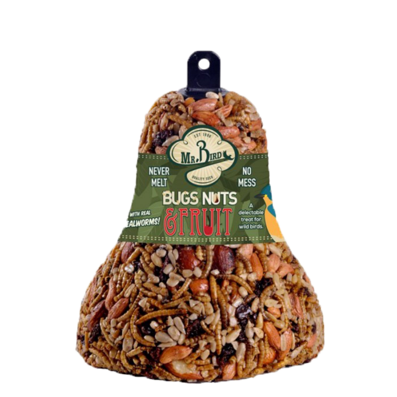 friends with it's fantastic blend of mealworms, pecans, sunflower hearts, raisins and cranberries. Birds absolutely love this seed bell. Comes ready to hang! This Mr. Bird seed bell will perform best when kept dry.