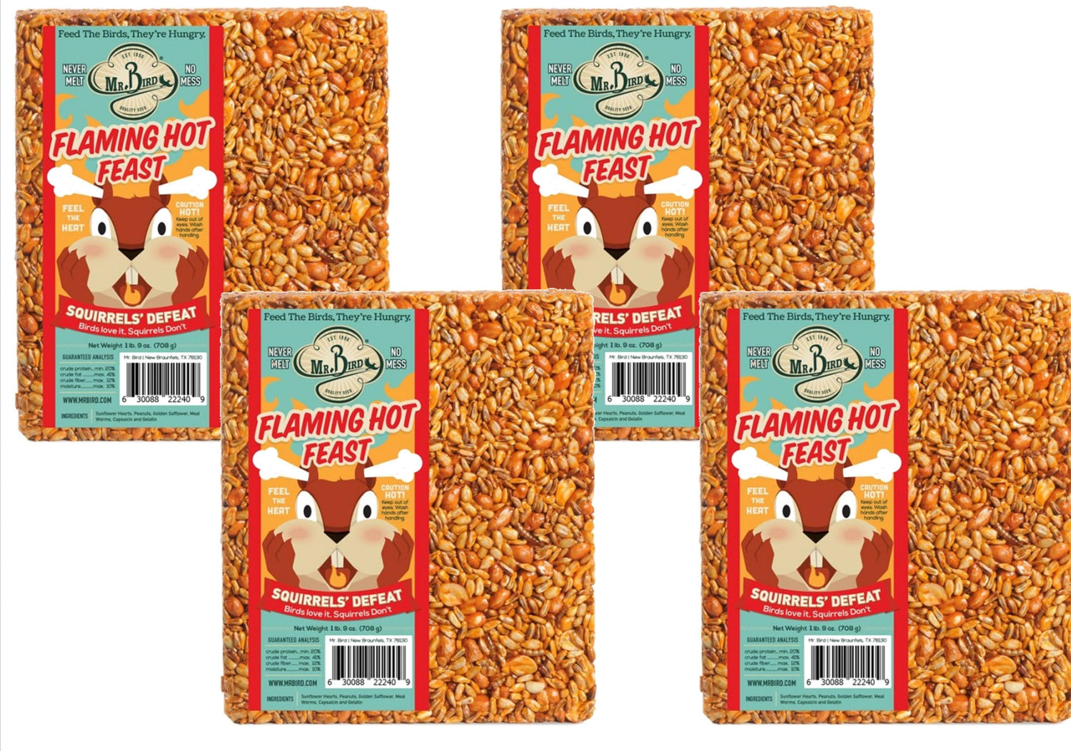 Discover spicy hot snacks for bird feeding without squirrels! After the first taste, most squirrels search for food elsewhere because they can't stand the fiery-hot sensation, which won't bother your birds. Contains whole sunflower hearts, shelled peanuts, golden safflower seed, mealworms and capsaicin. Perfect for year-round feeding! This Mr. Bird seed cake will perform best when kept dry.